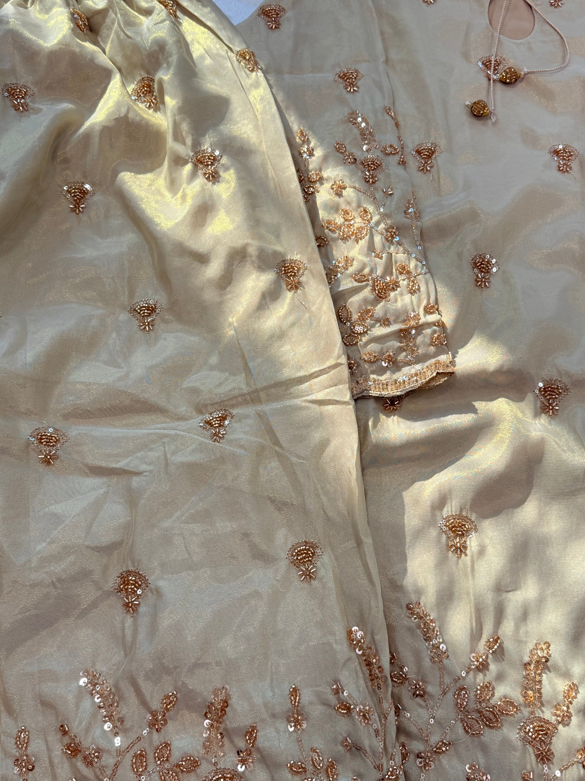 Top Cosmos silk designer stitched with lining....beautiful beads and thread handwork on neck and front ..length 36 inches