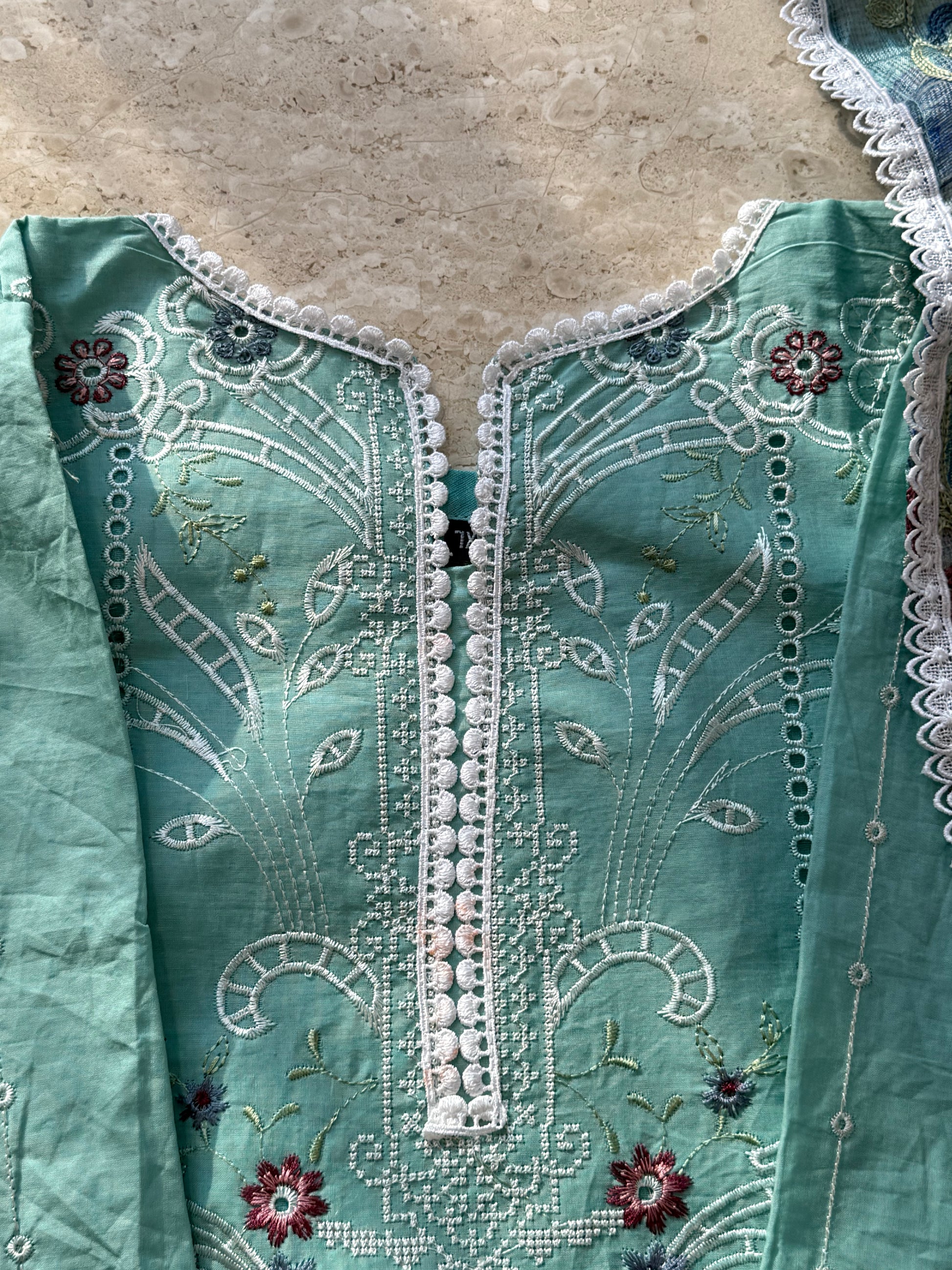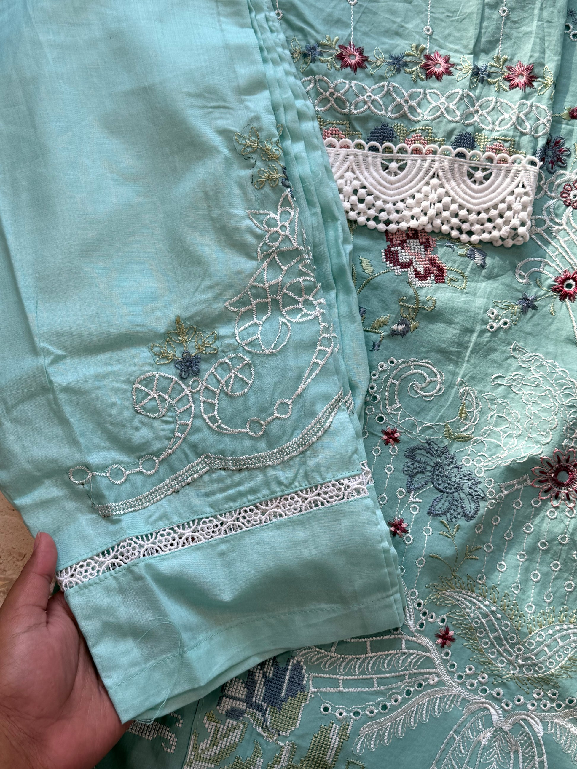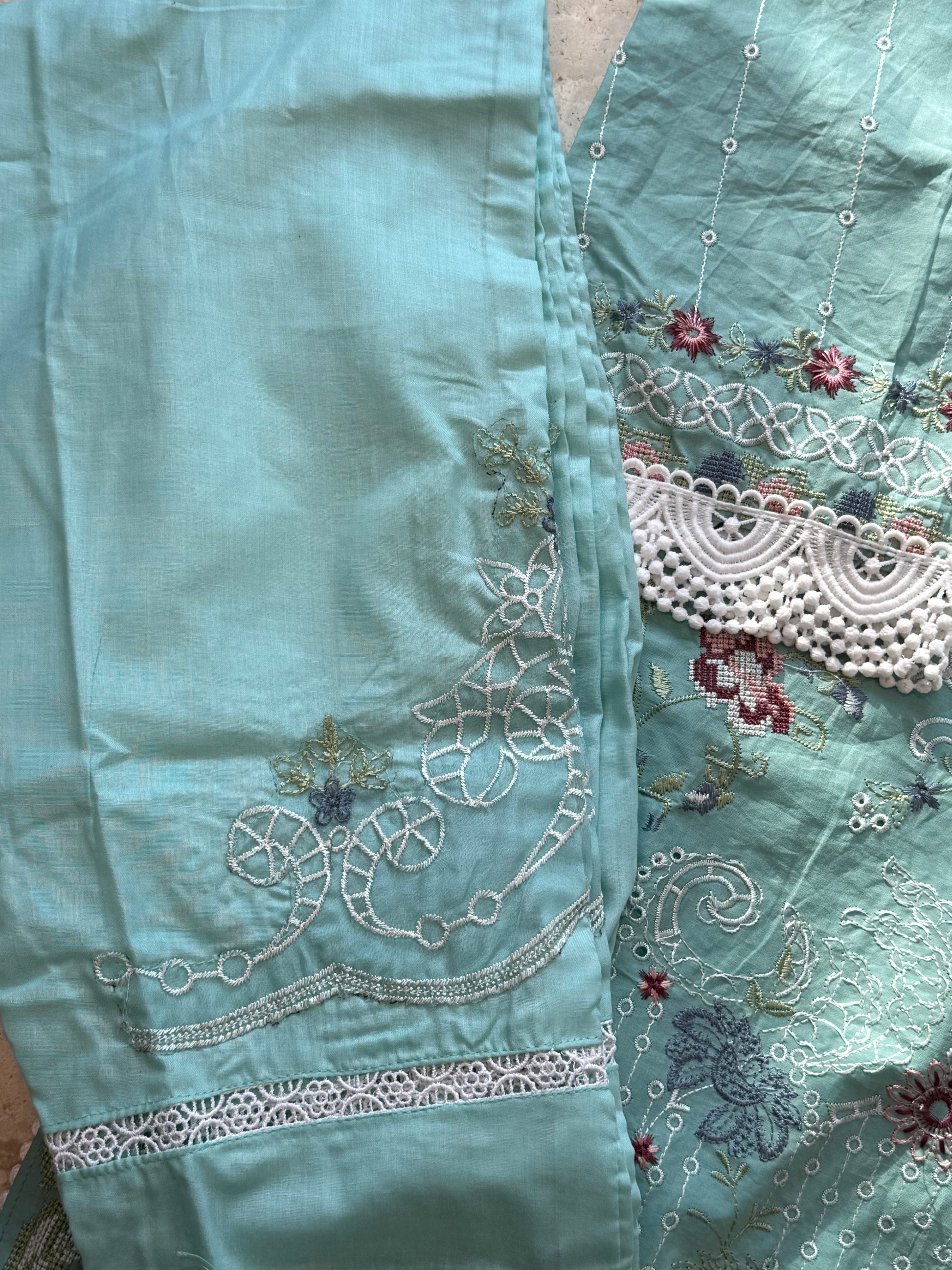 Top pure cotton designer stitched with lining.... beautiful self embroidery on front.... pakistani style neck with patch and laces ... Extra lace on front top.....length 45 inches...