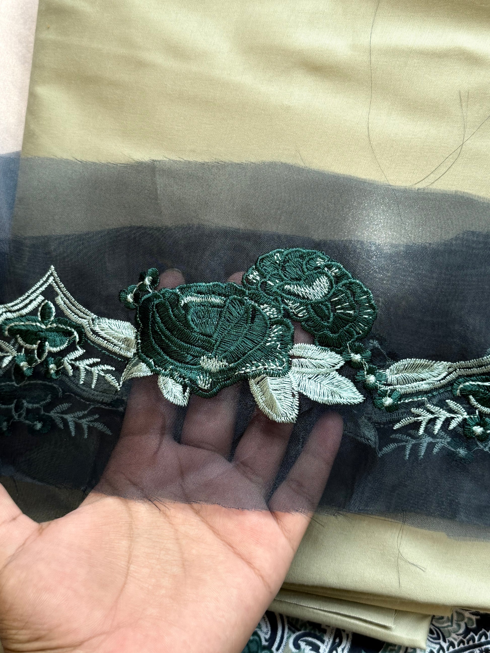Top printed cotton designer un-stitched material with beautiful embroidery patches for neck .