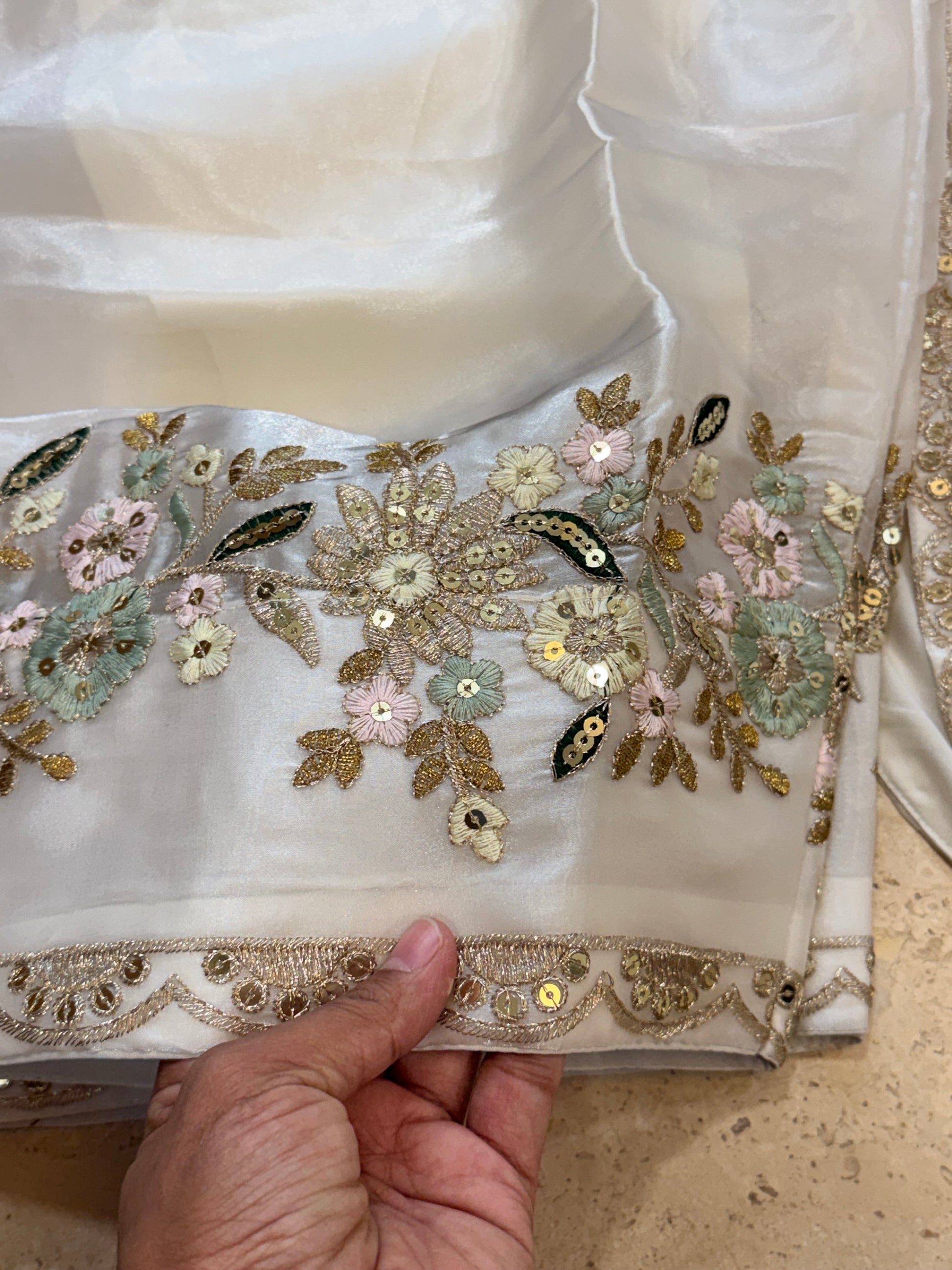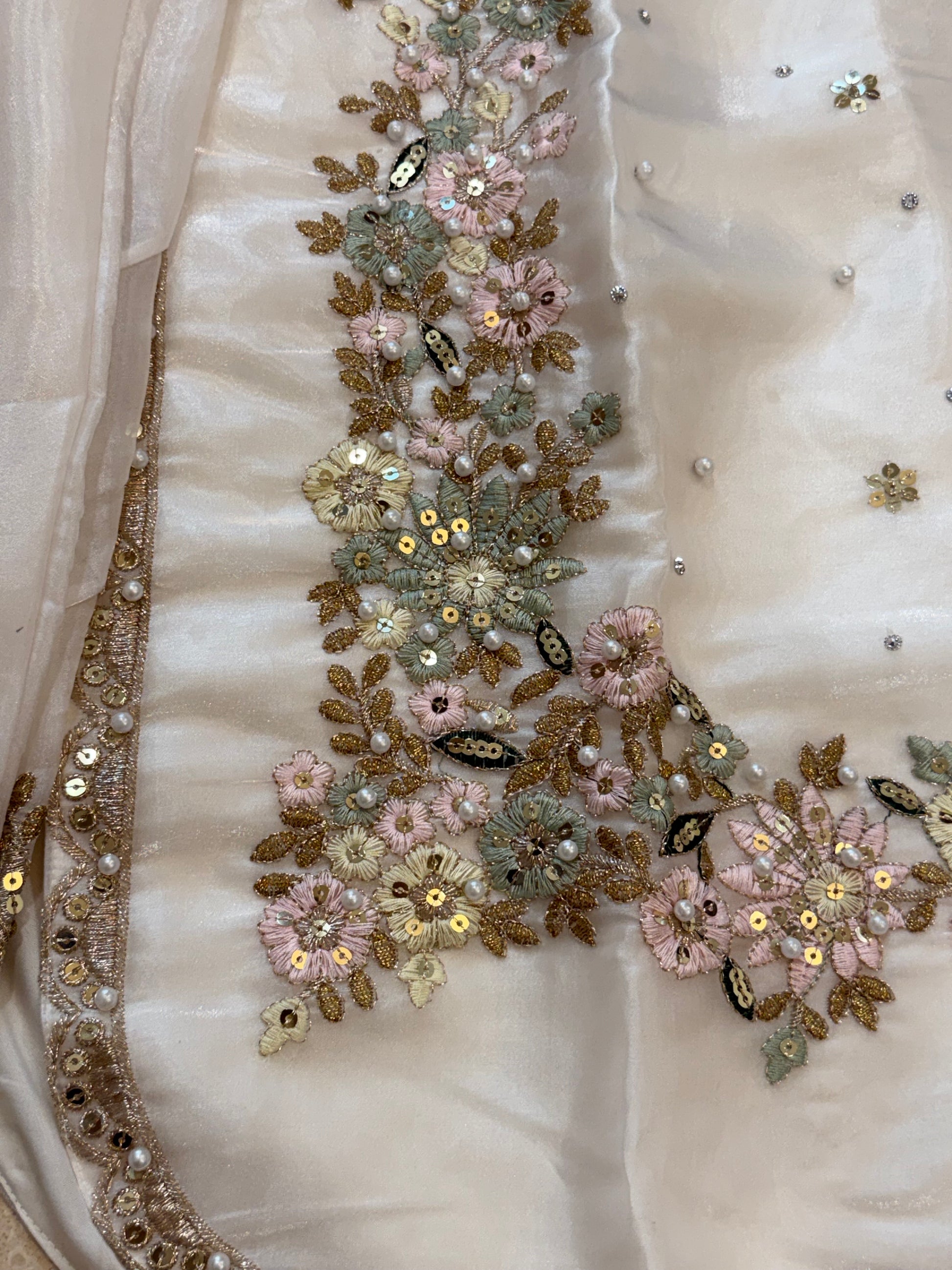 Top Jimmy choo material with beautiful embroidery on front ..... top Length 37 inches...plain back ....stitched with lining