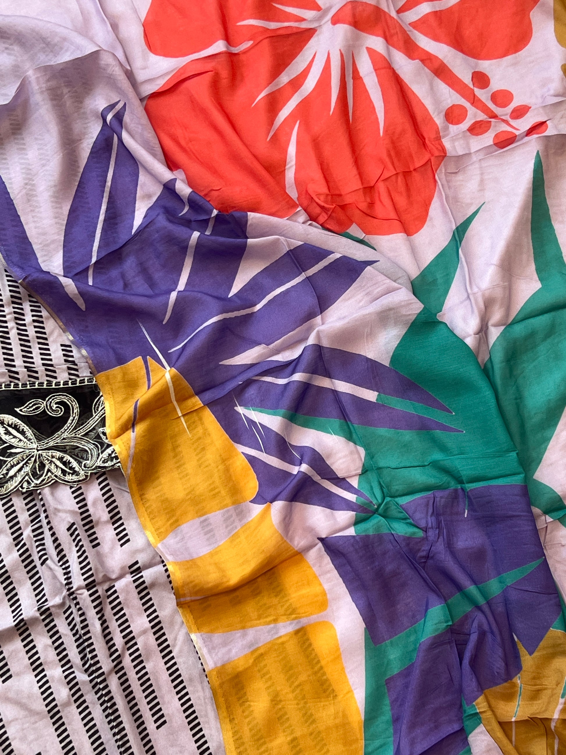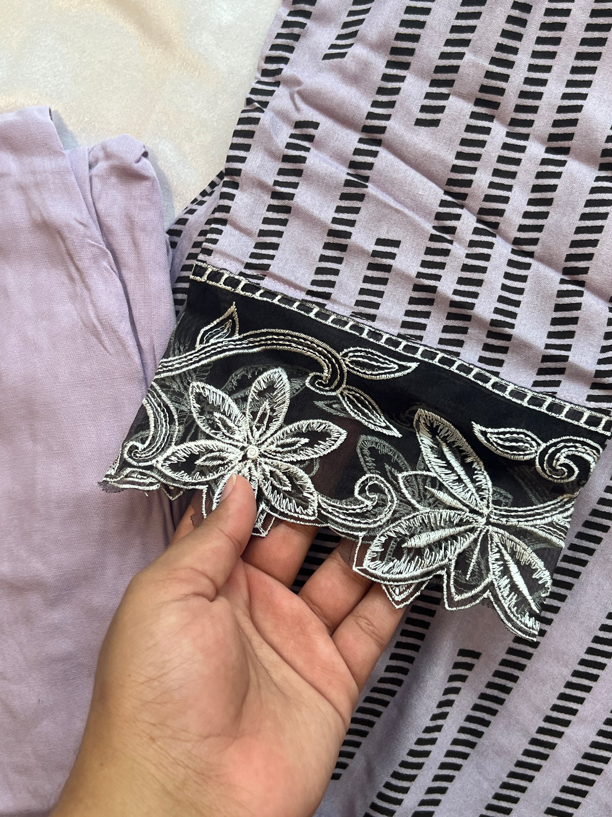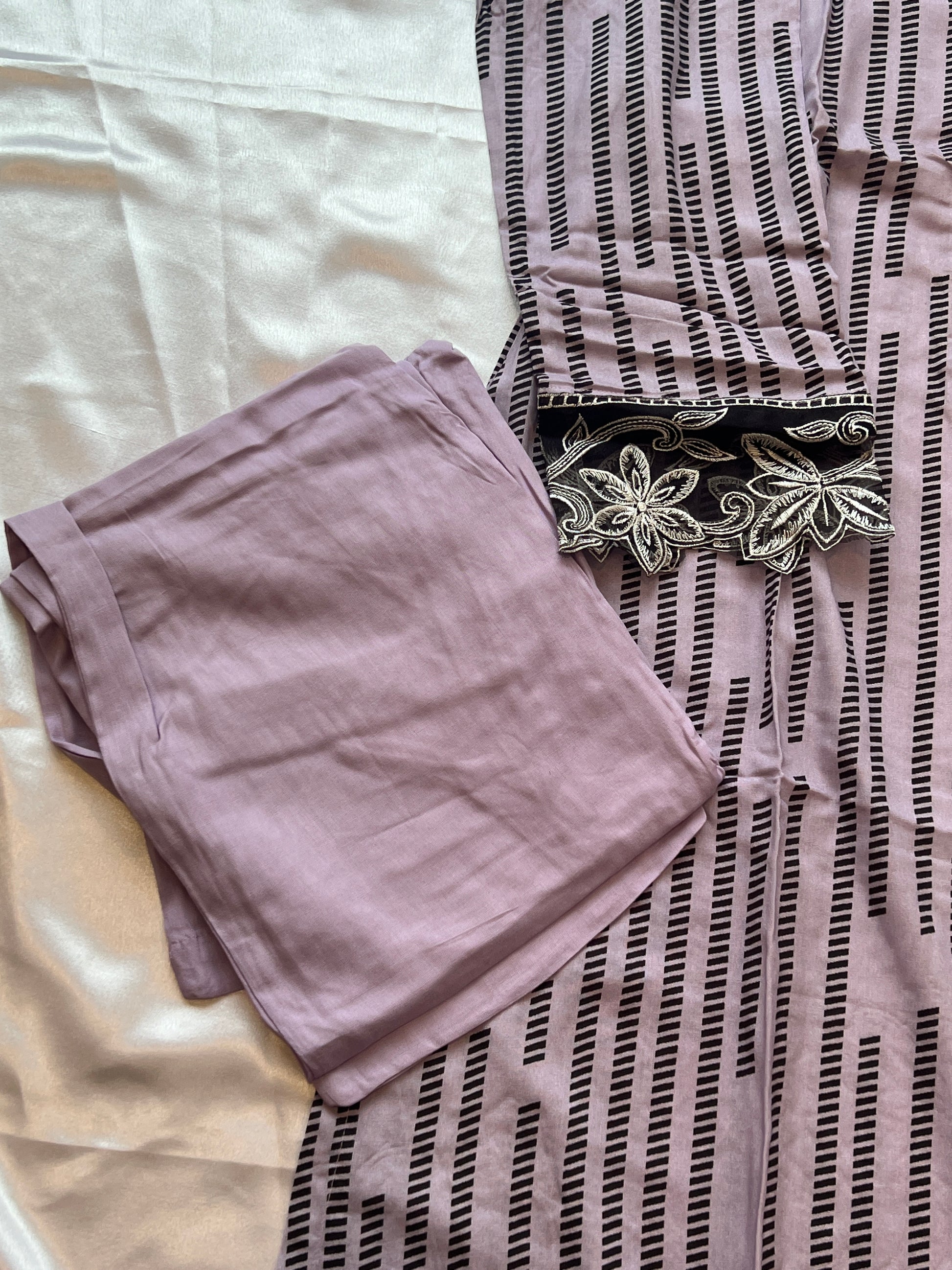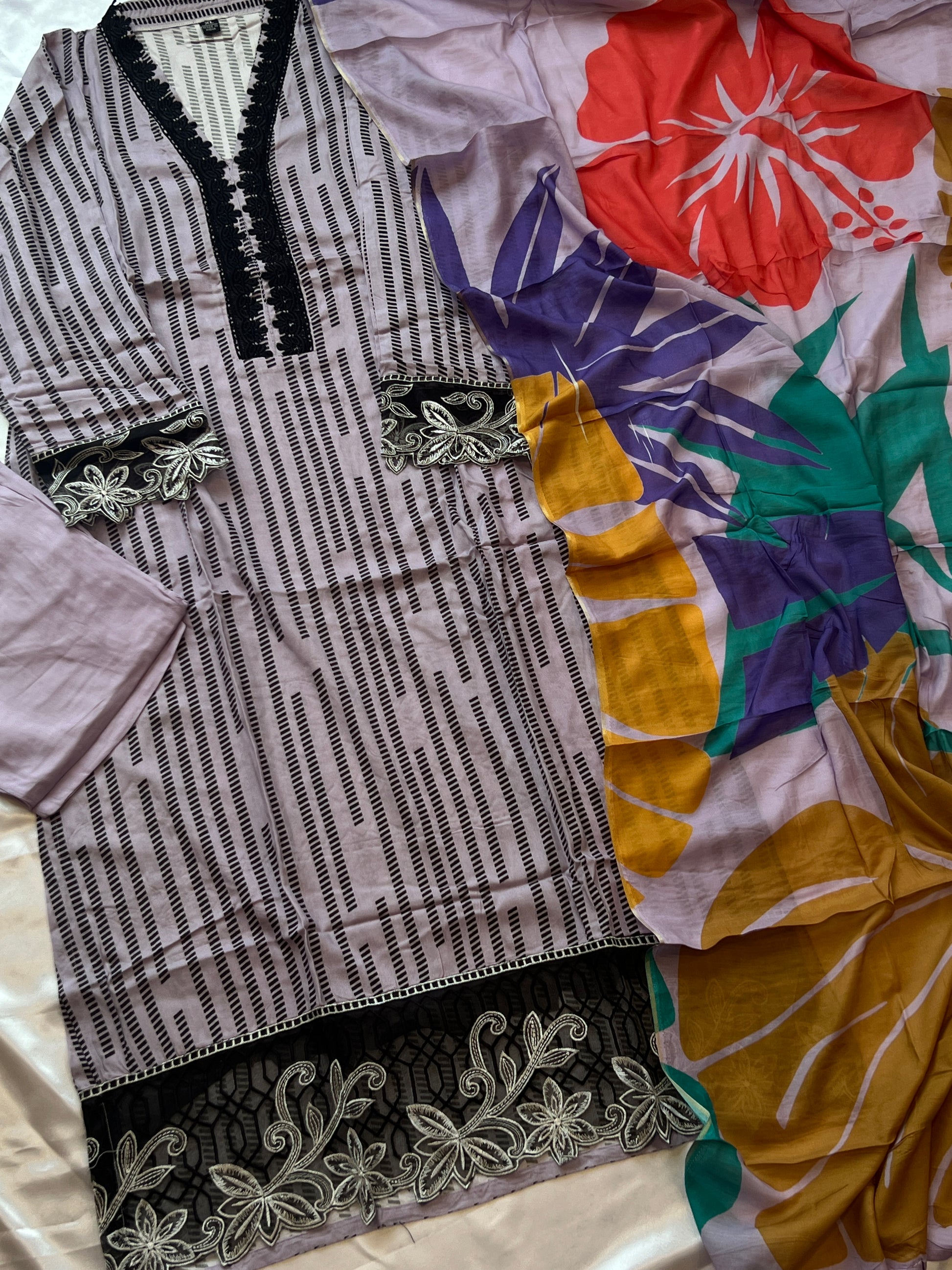 Top Lawn printed... beautiful embroidery patch on top and sleeves... pakistani style neck made with black lace ....lenght 45 inches