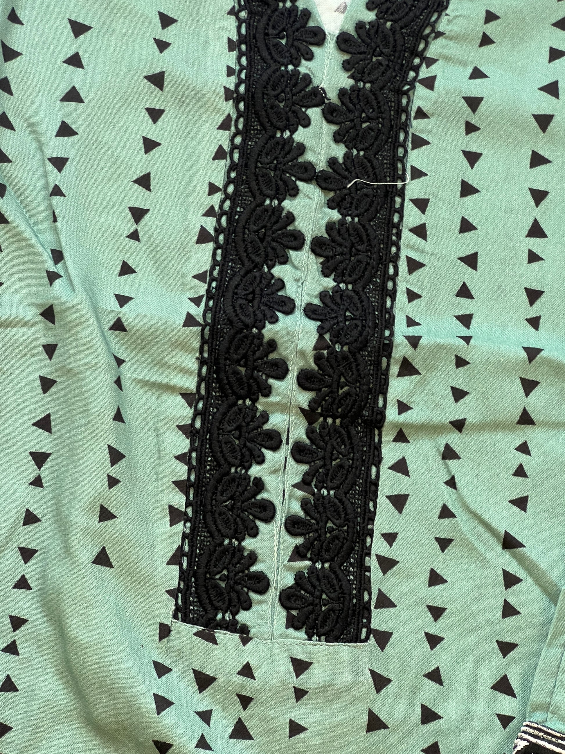 Top Lawn printed... beautiful embroidery patch on top and sleeves... pakistani style neck made with black lace ....lenght 45 inches