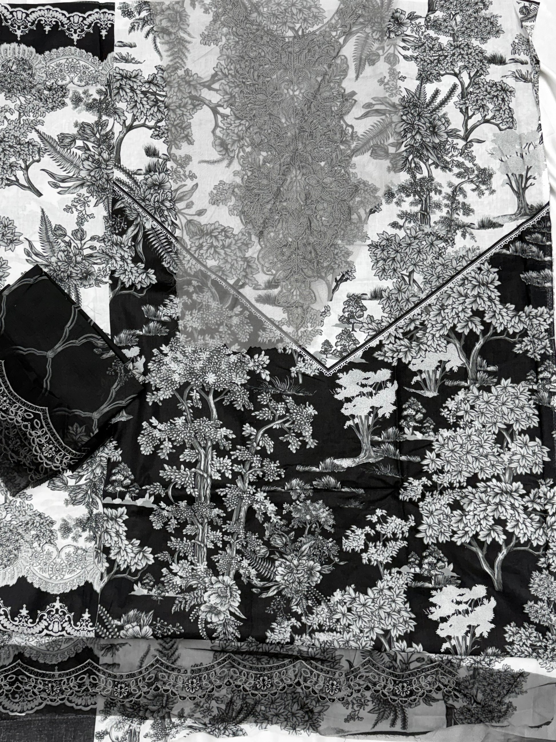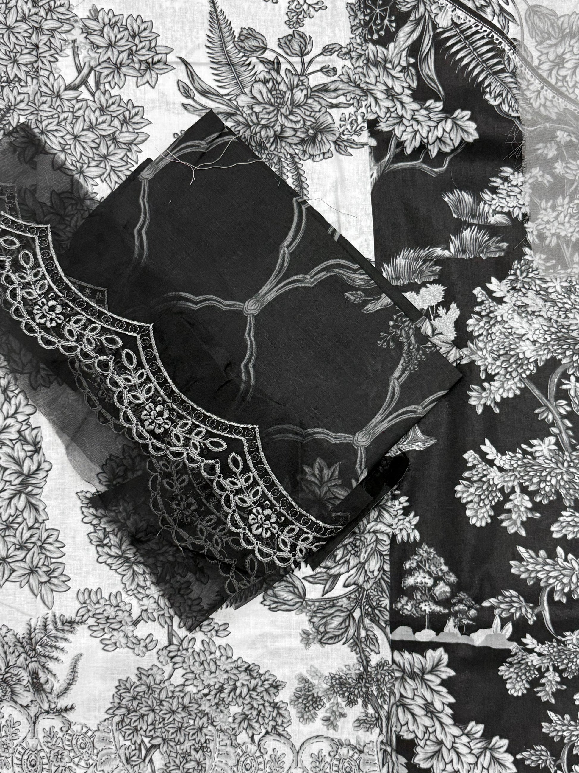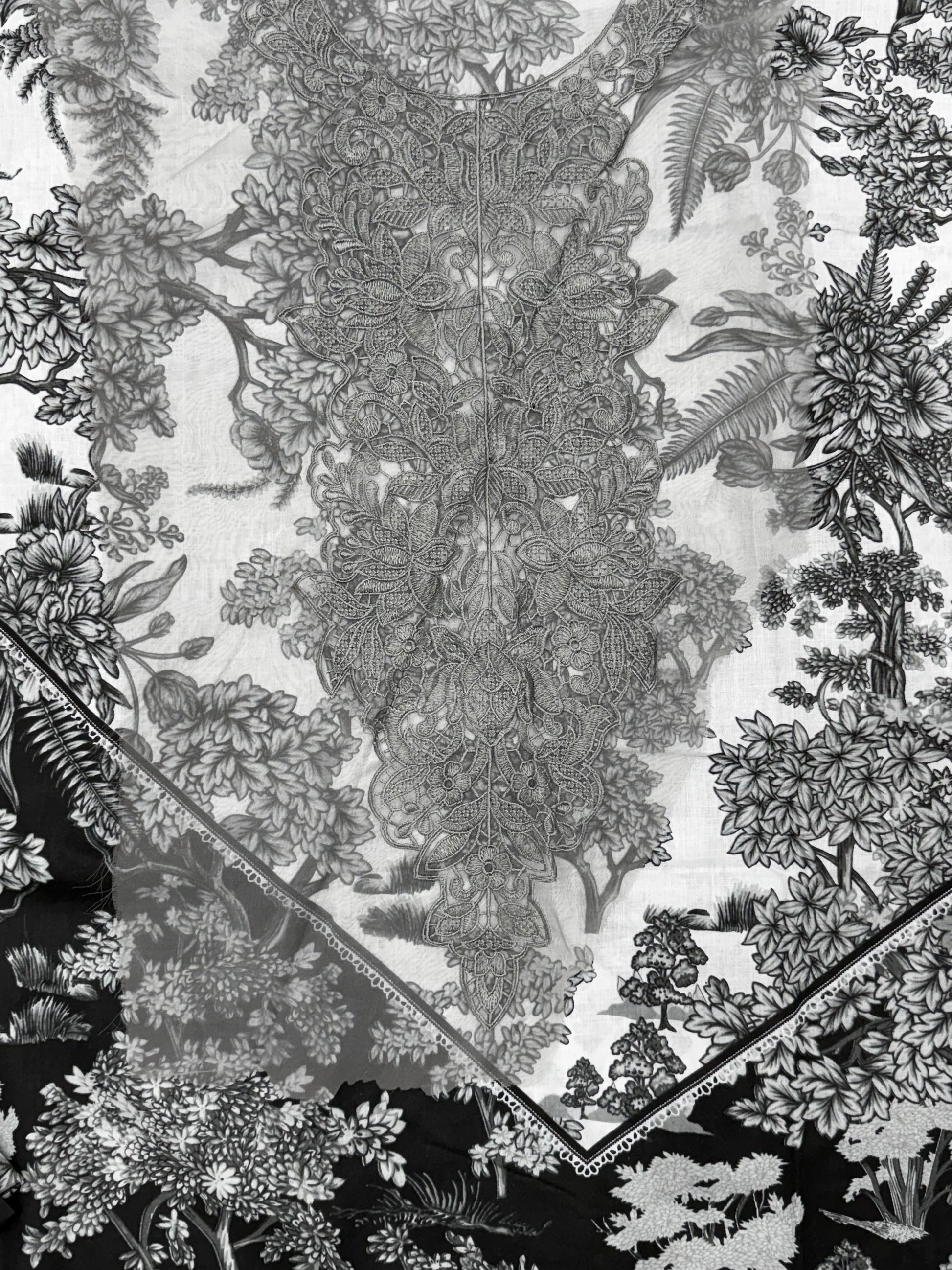 Top printed cotton designer un-stitched material with beautiful embroidery patches for neck and sleeves...