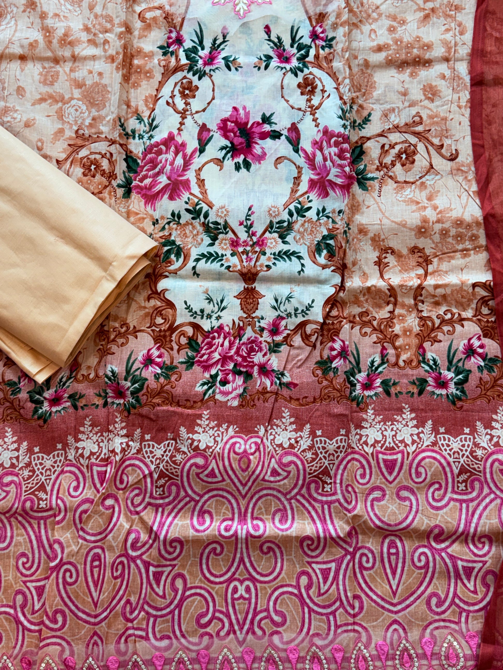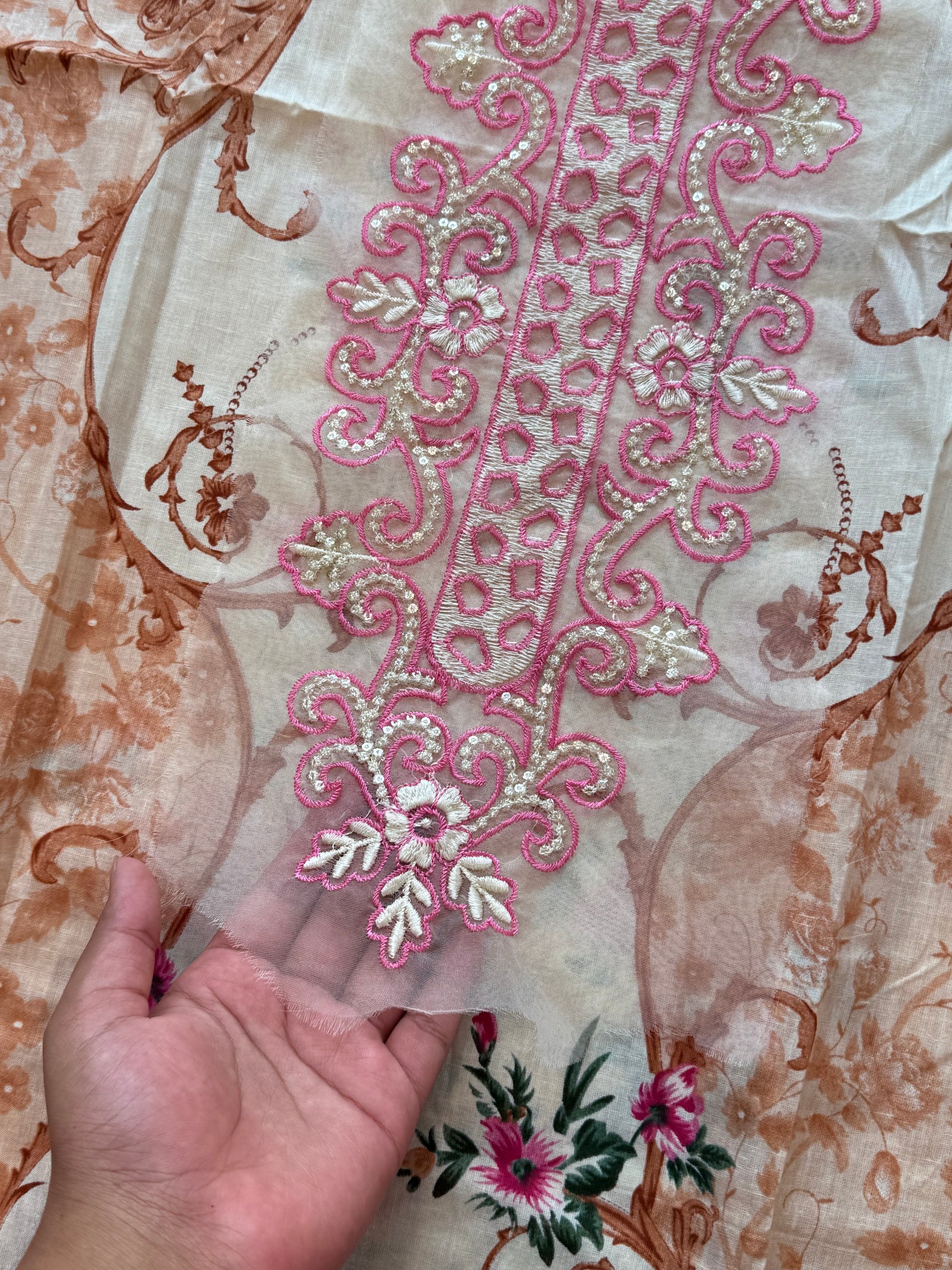 Top printed cotton designer un-stitched material with beautiful embroidery patches for neck and sleeves...