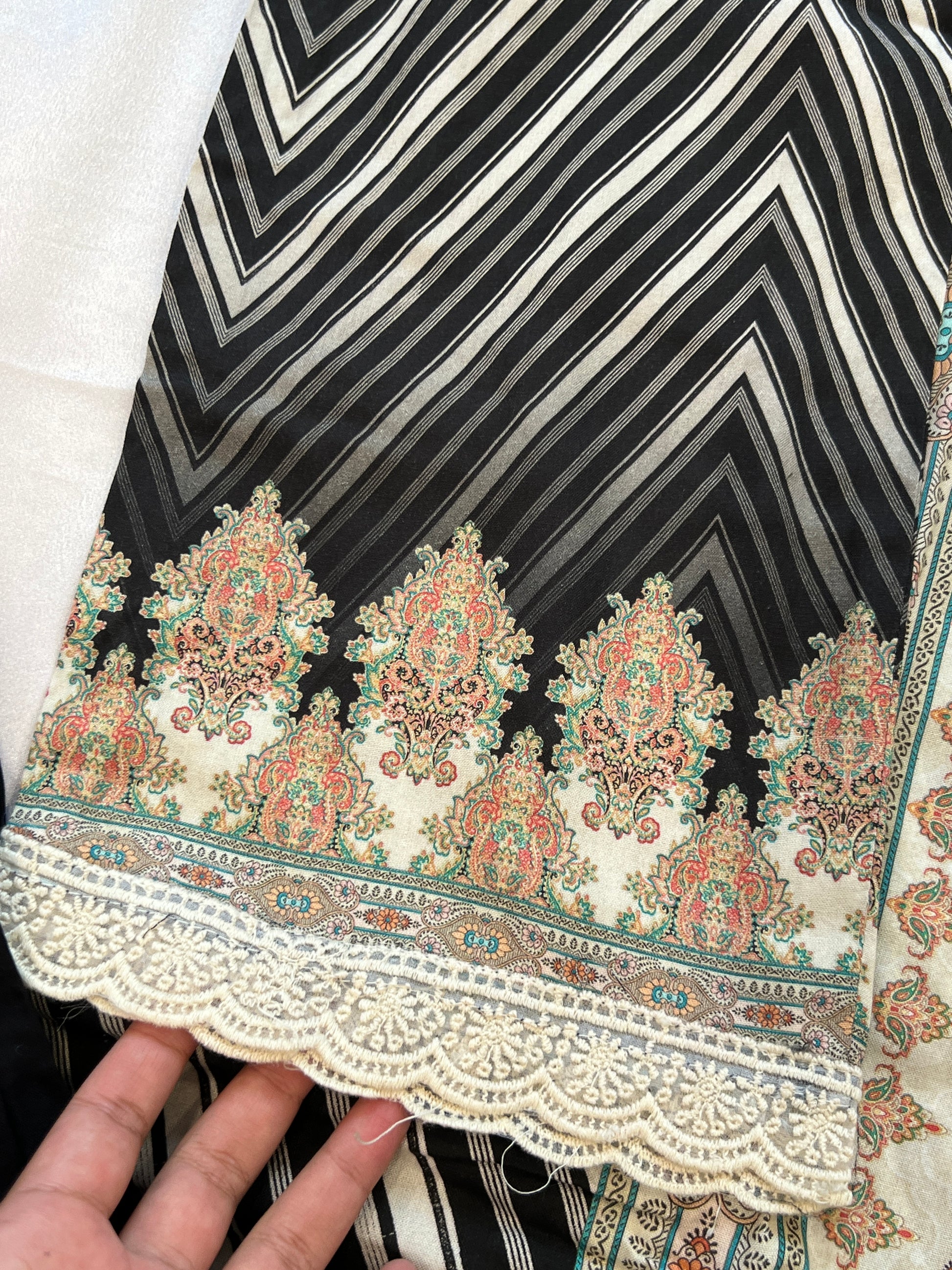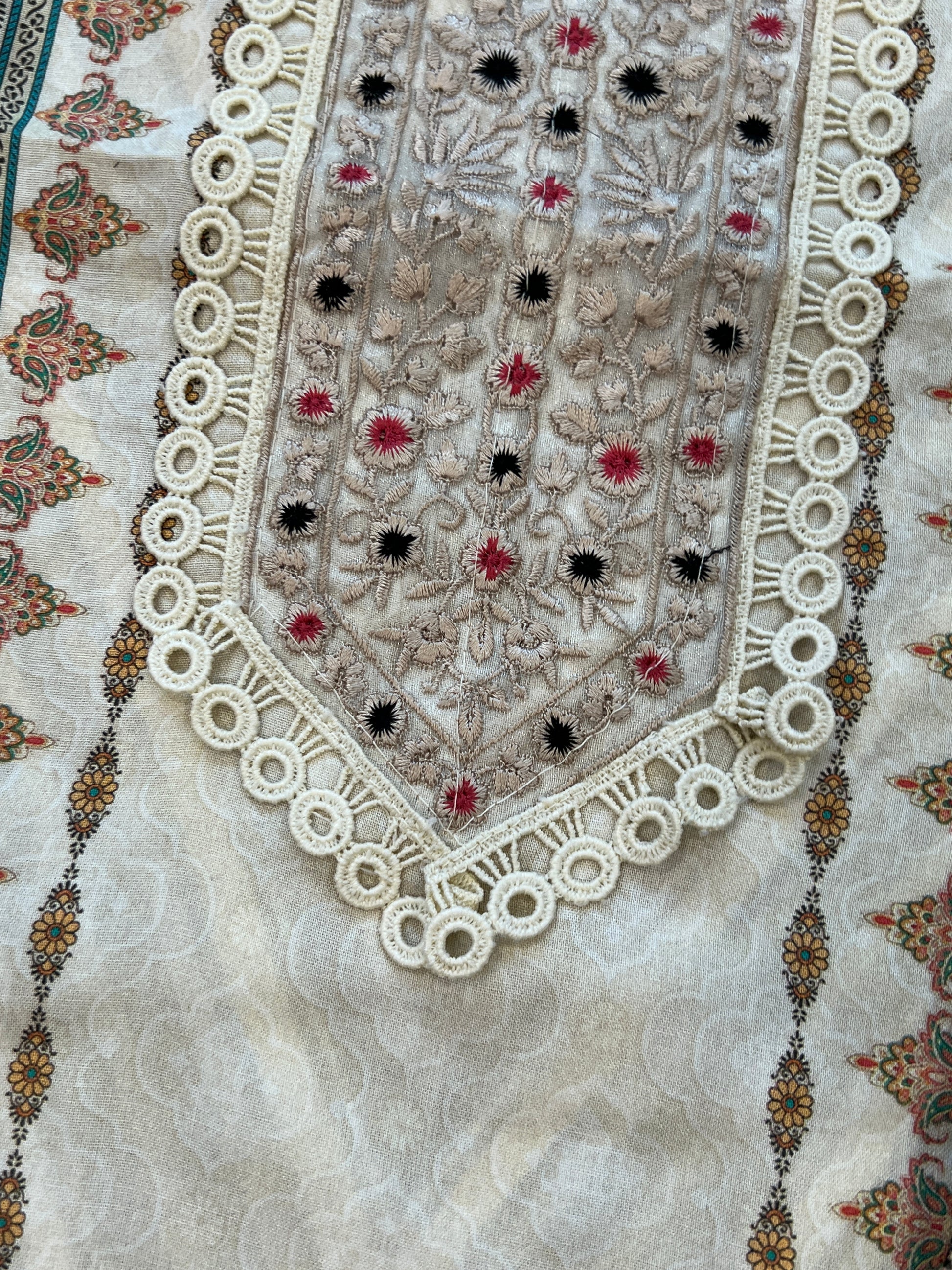 Top cotton Mill printed... beautiful embroidery on neck with beads…beautiful lace on Daman and sleeves ...Top length 48 Inches