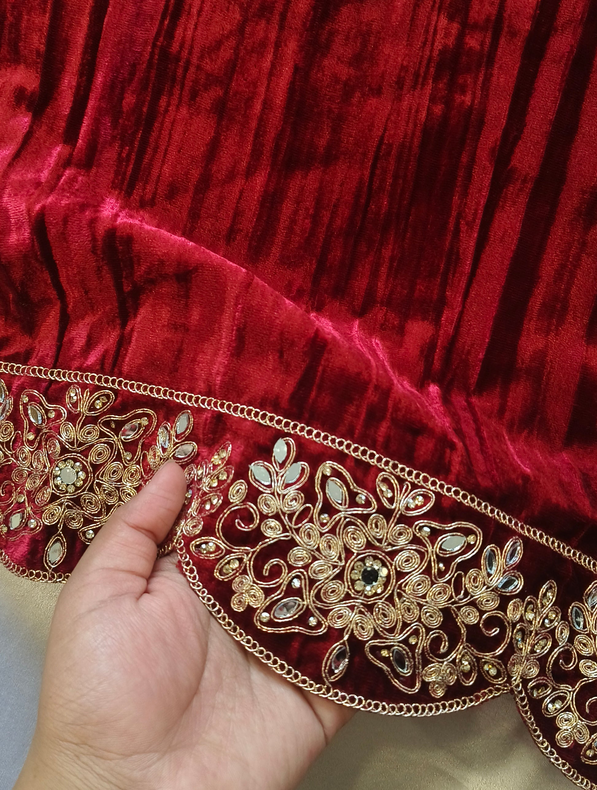 Top premium crush velvet with kundan and golden thread work on neck ,daman and sleeves...plain velvet back....Length 49 inches . bust 56