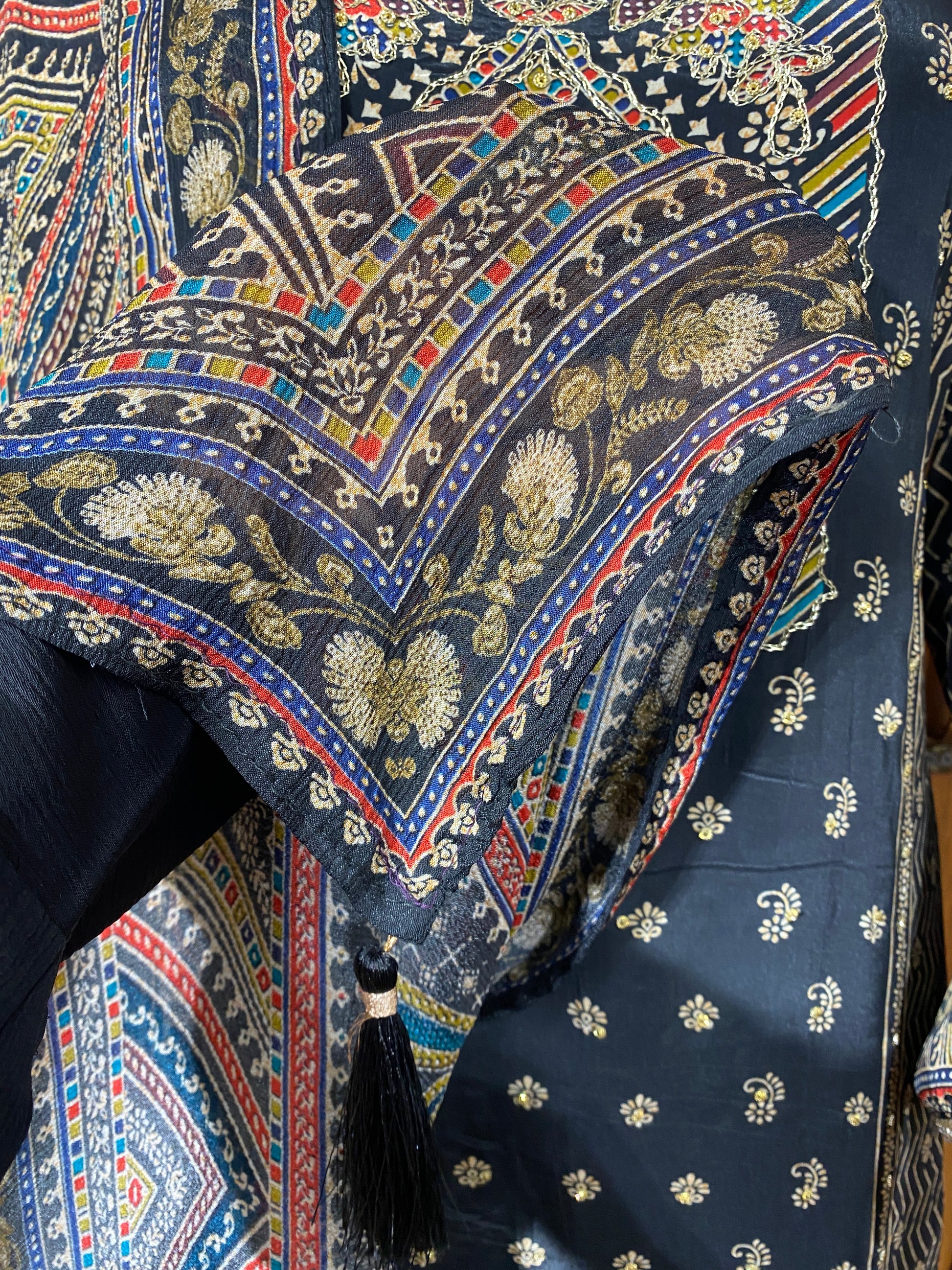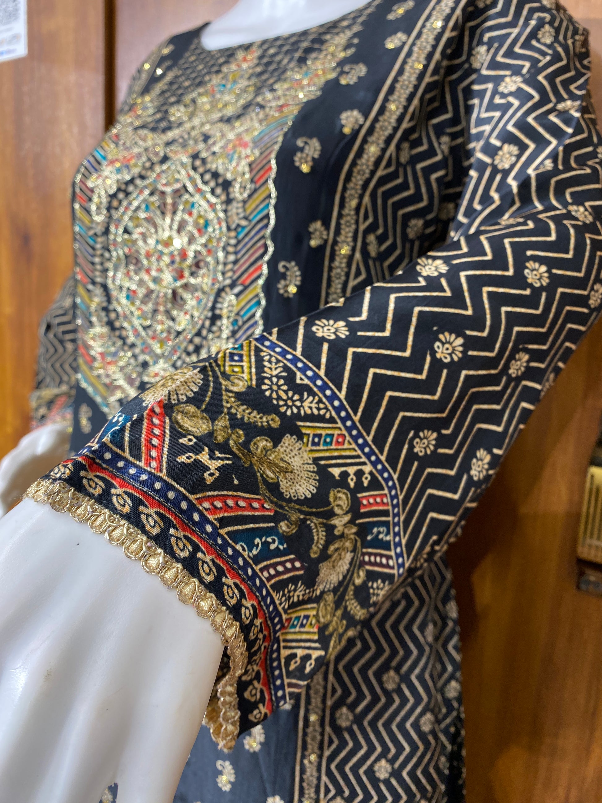 Top Muslin printed with beautiful embroidery detailing on neck. lace on sleeves and daman....length 45 inches