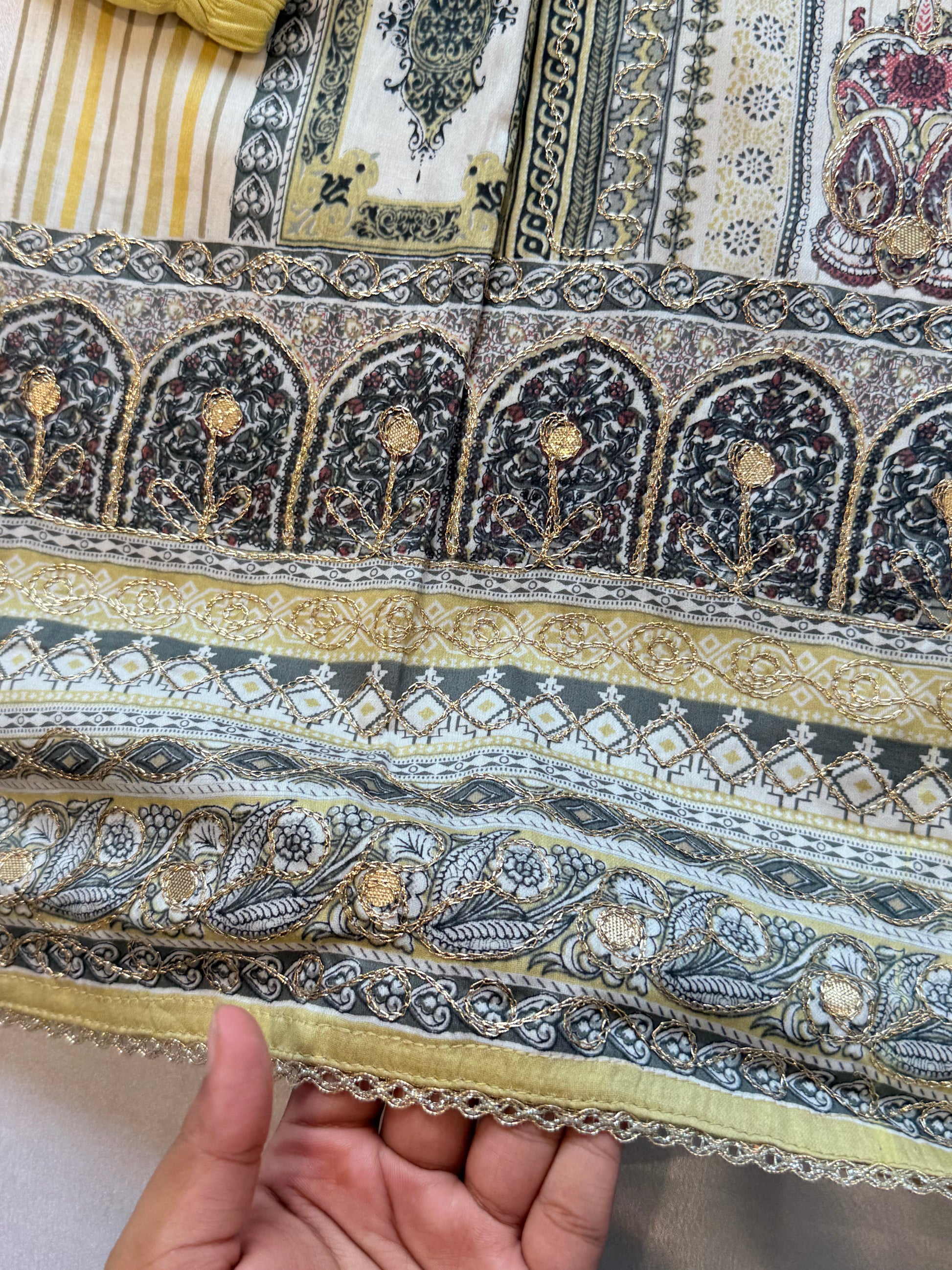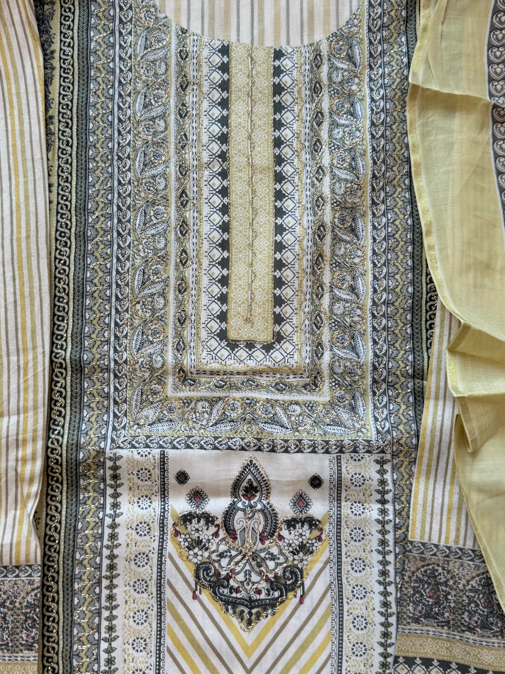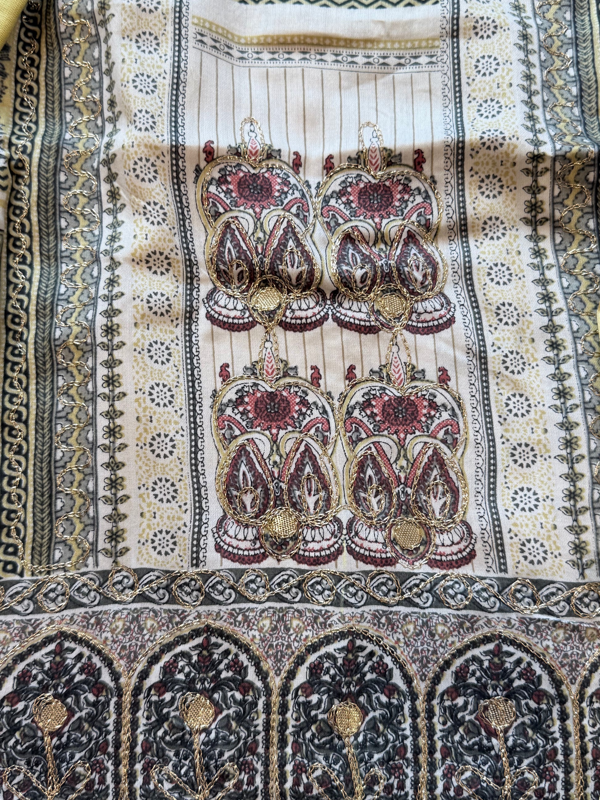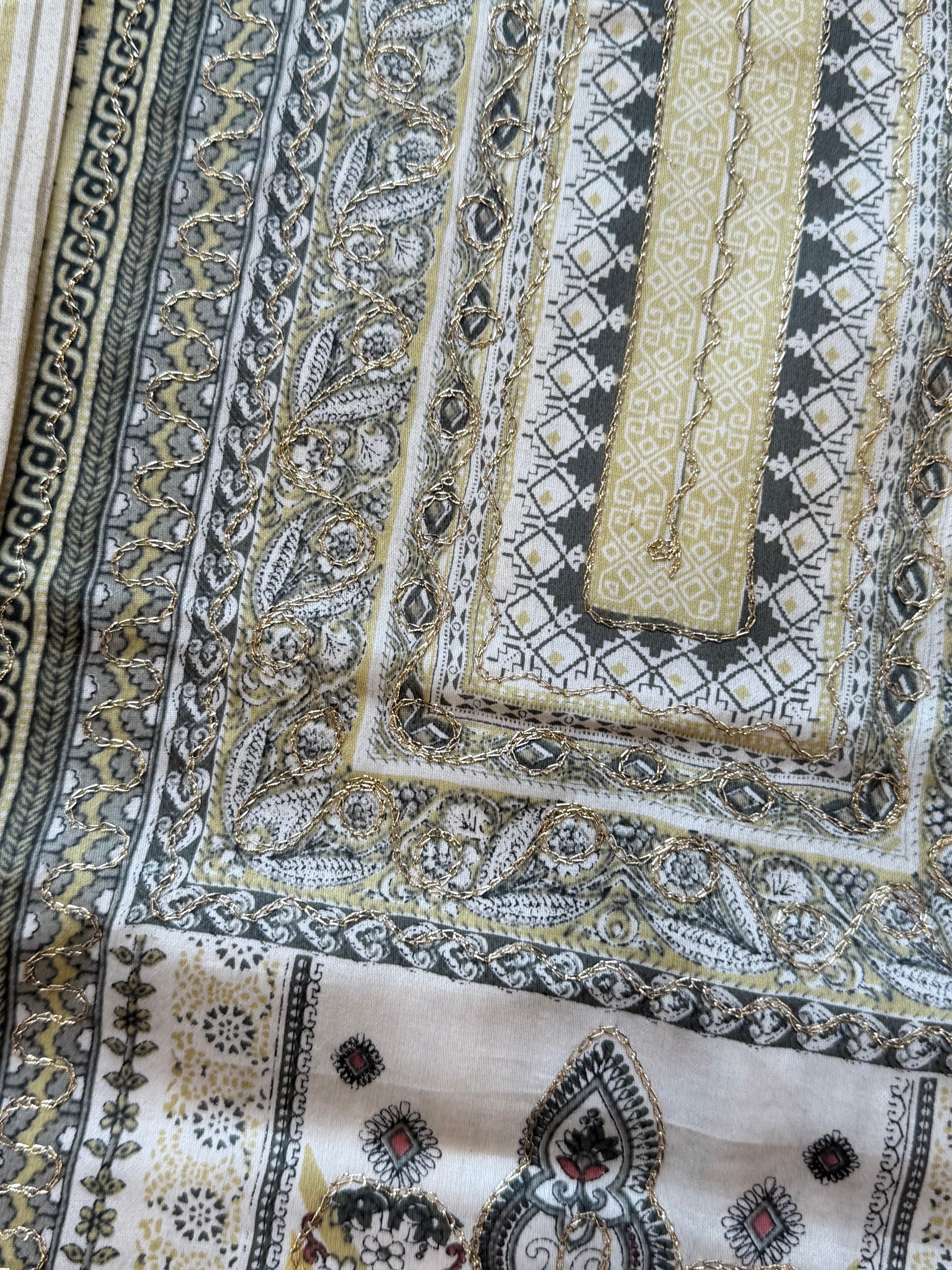 Top Lawn printed with golden thread work on neck and front.......length 43inches