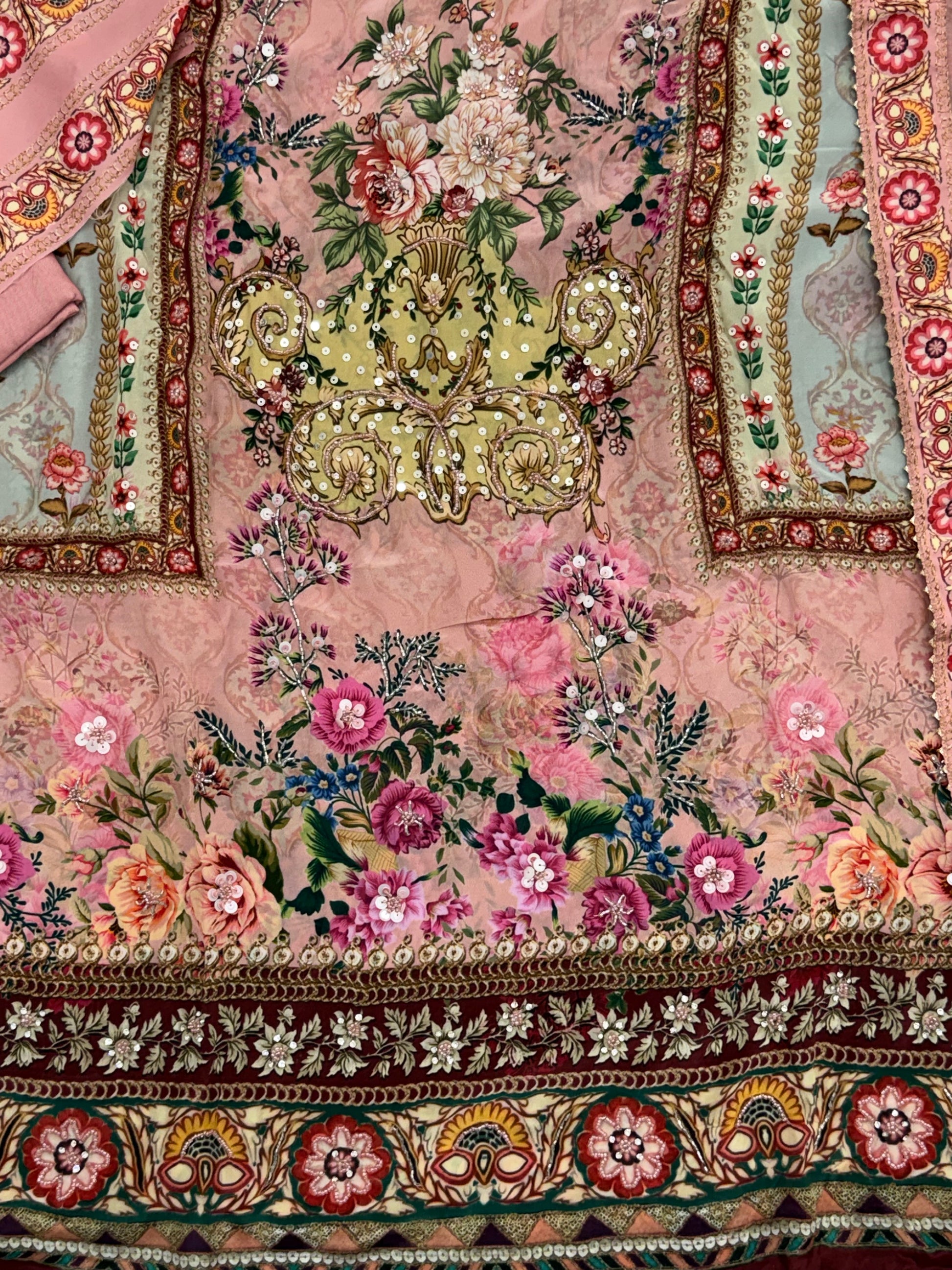 - Top pure crepe unstitched with beautiful digital print with hand embroidery....Bust 52 inches can be stitched ....Length 46 inches