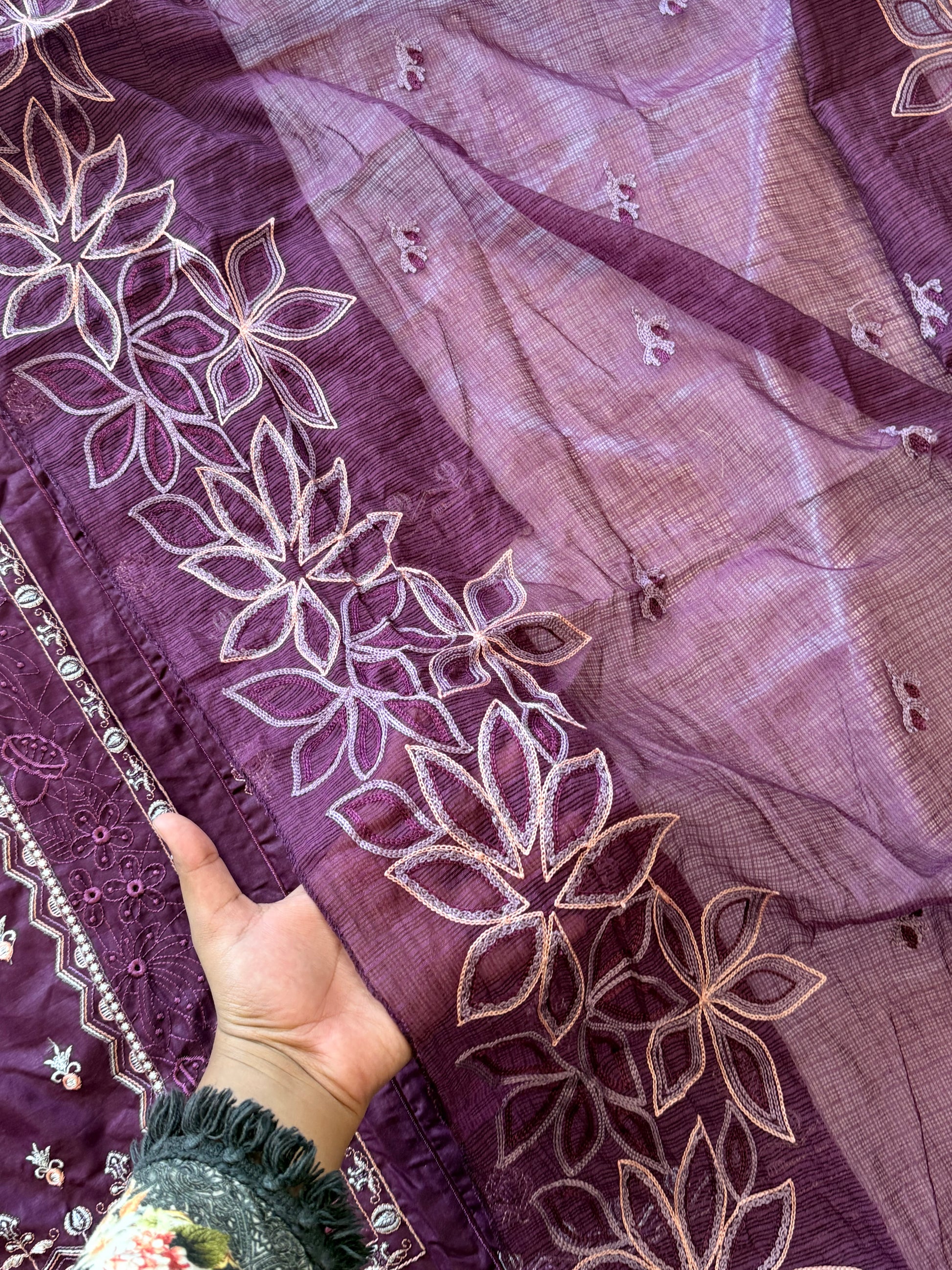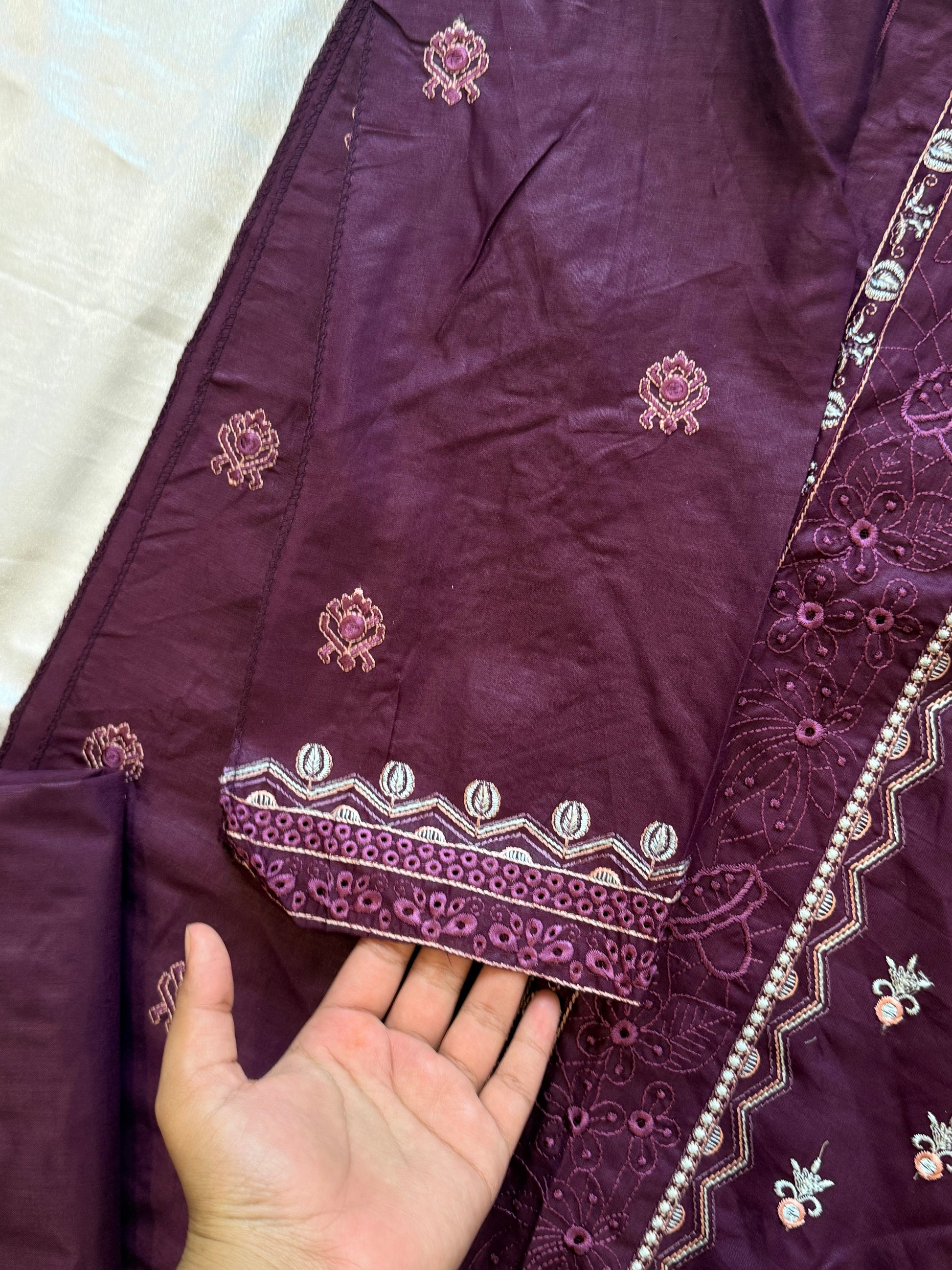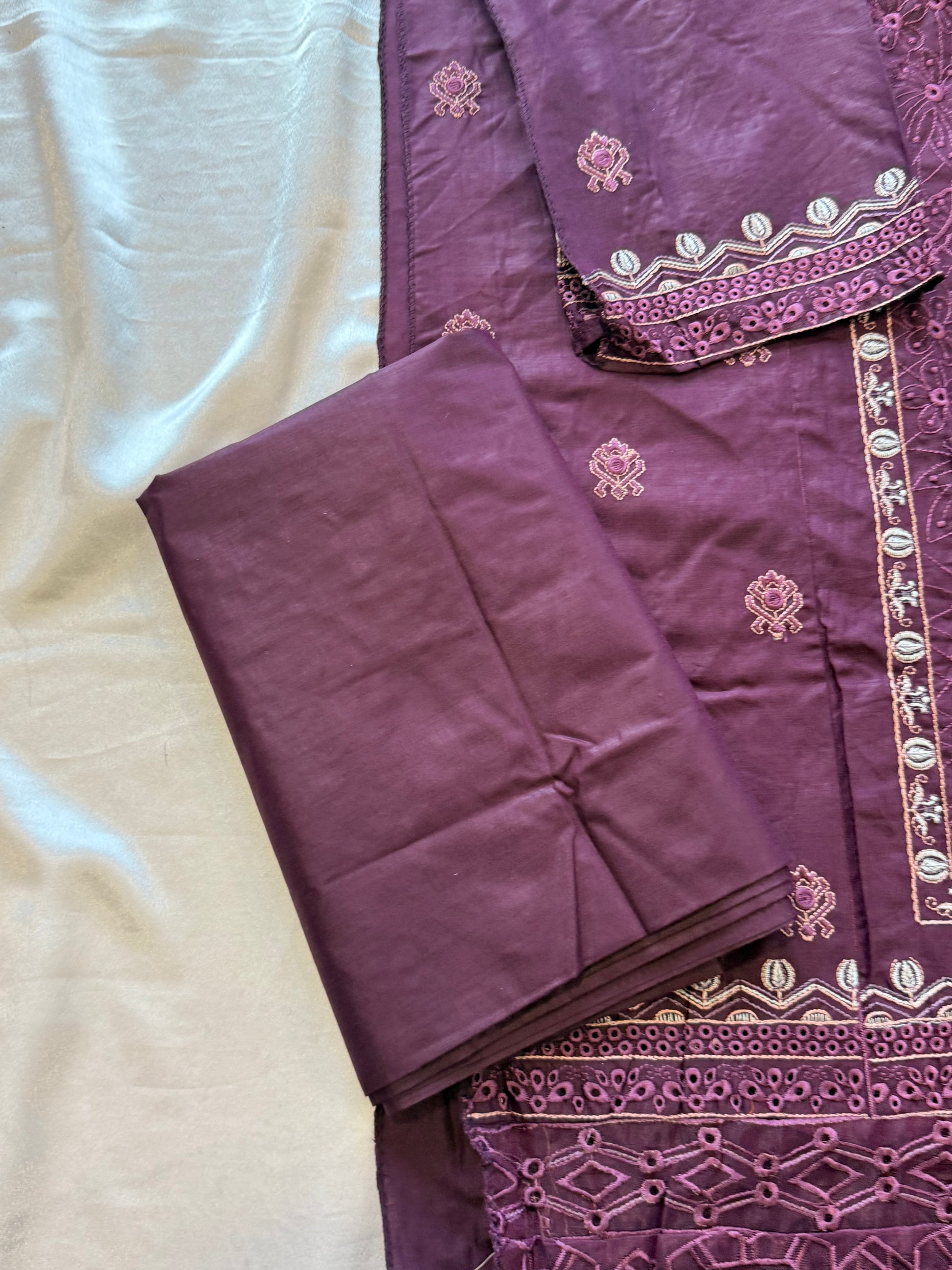 Top pure cotton designer un-stitched material with beautiful self embroidery and patch on front top......bust 54 Inches can be stitched..length 45 inches...