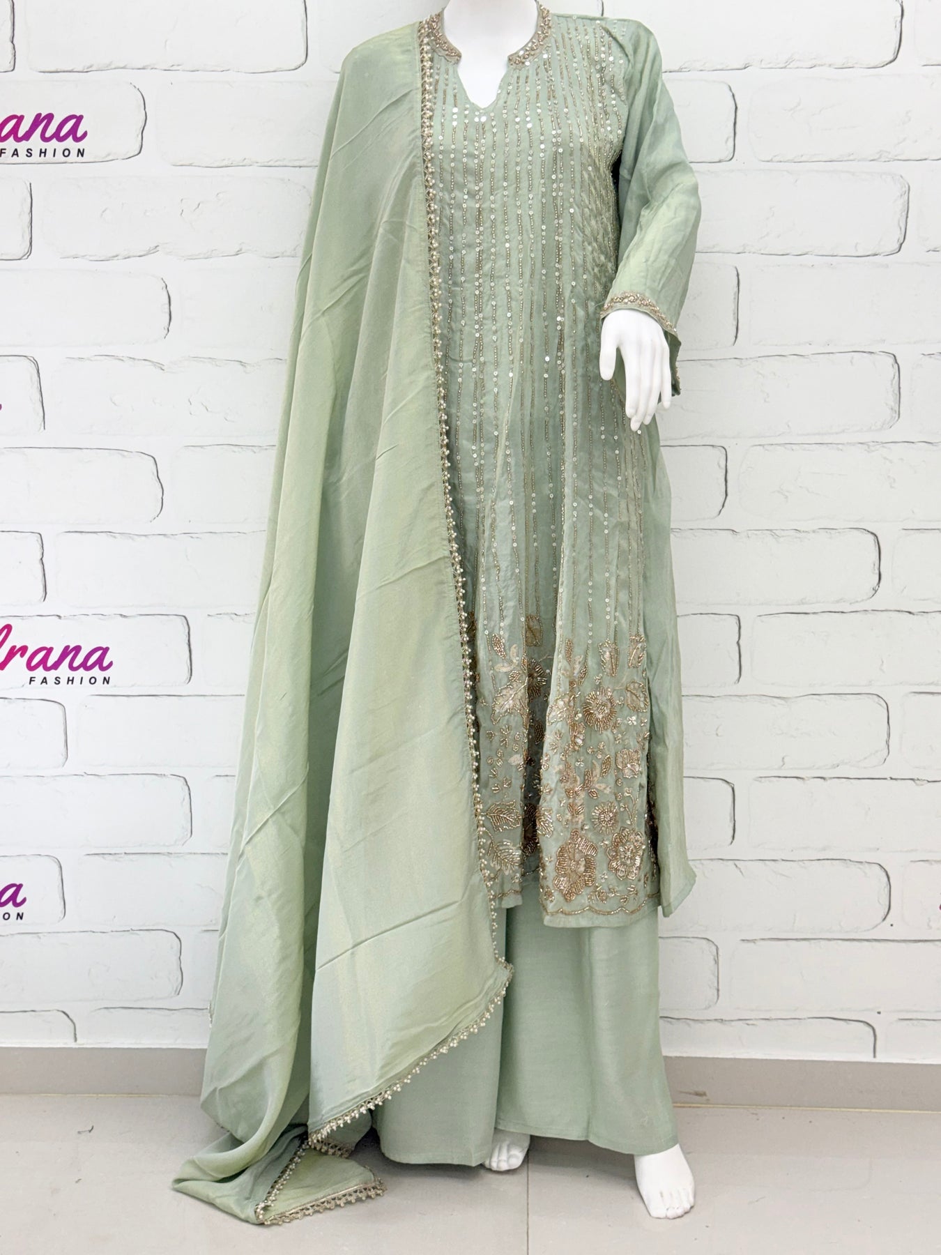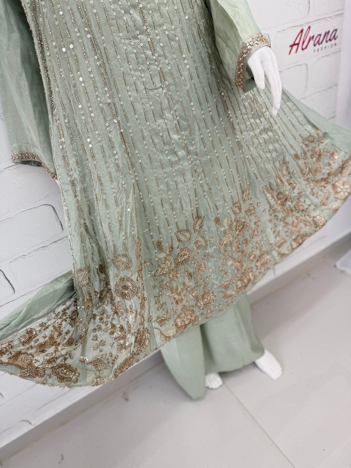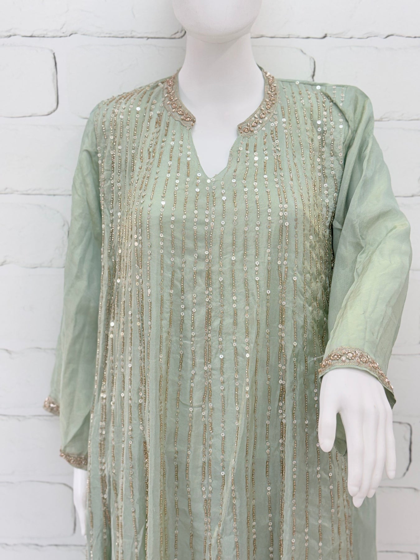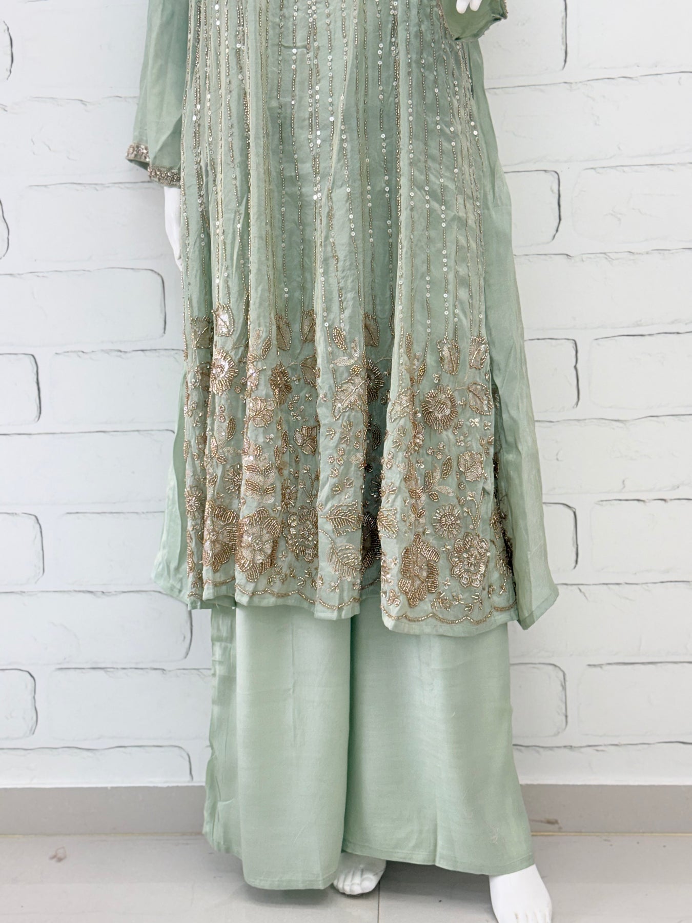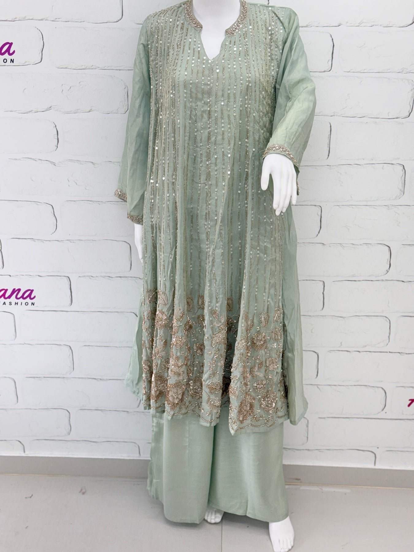 Top Shimmer material..... Frock style stitched with beautiful beads and sequence work on front.....Pakistani style neck with handwork.... ,heavy boarder work on daman and sleeves.18 inches......attached lining......length 51 inches