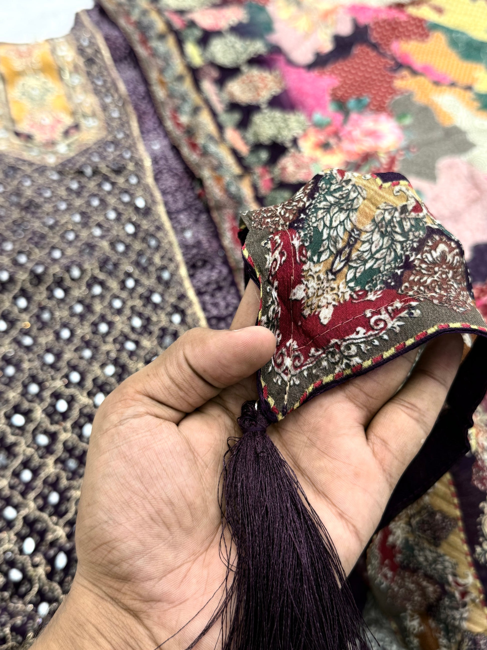 Top natural pure crepe with beautiful heavy embroidery and hand work...with attached lining... sleeves Length 20inches... Length 43 Inches