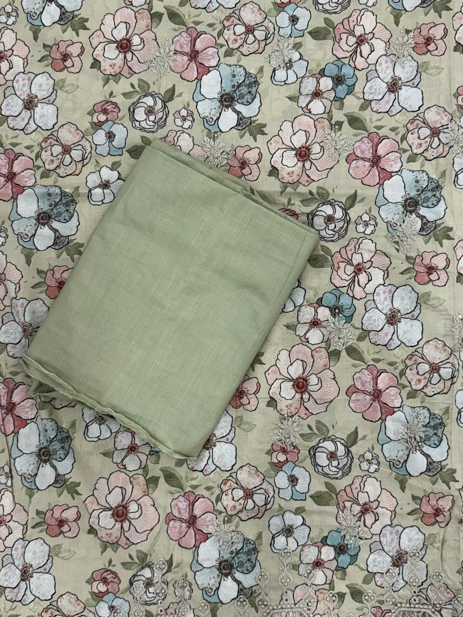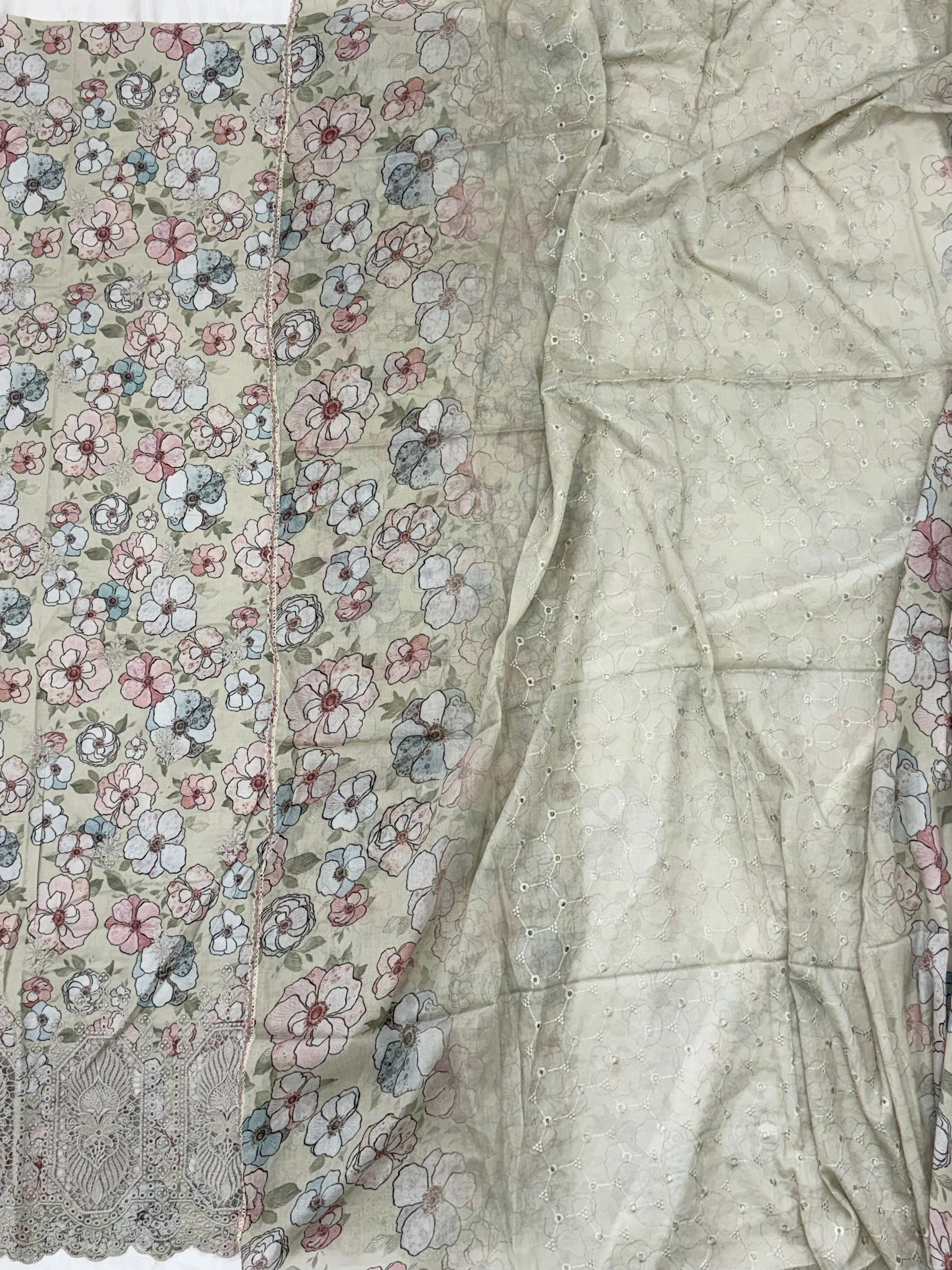 Top Lawn cotton .. beautiful Self embroidery on front...heavy embroidery boarder with cutwork ..length 48 Inch..Bust 58 can be stitched