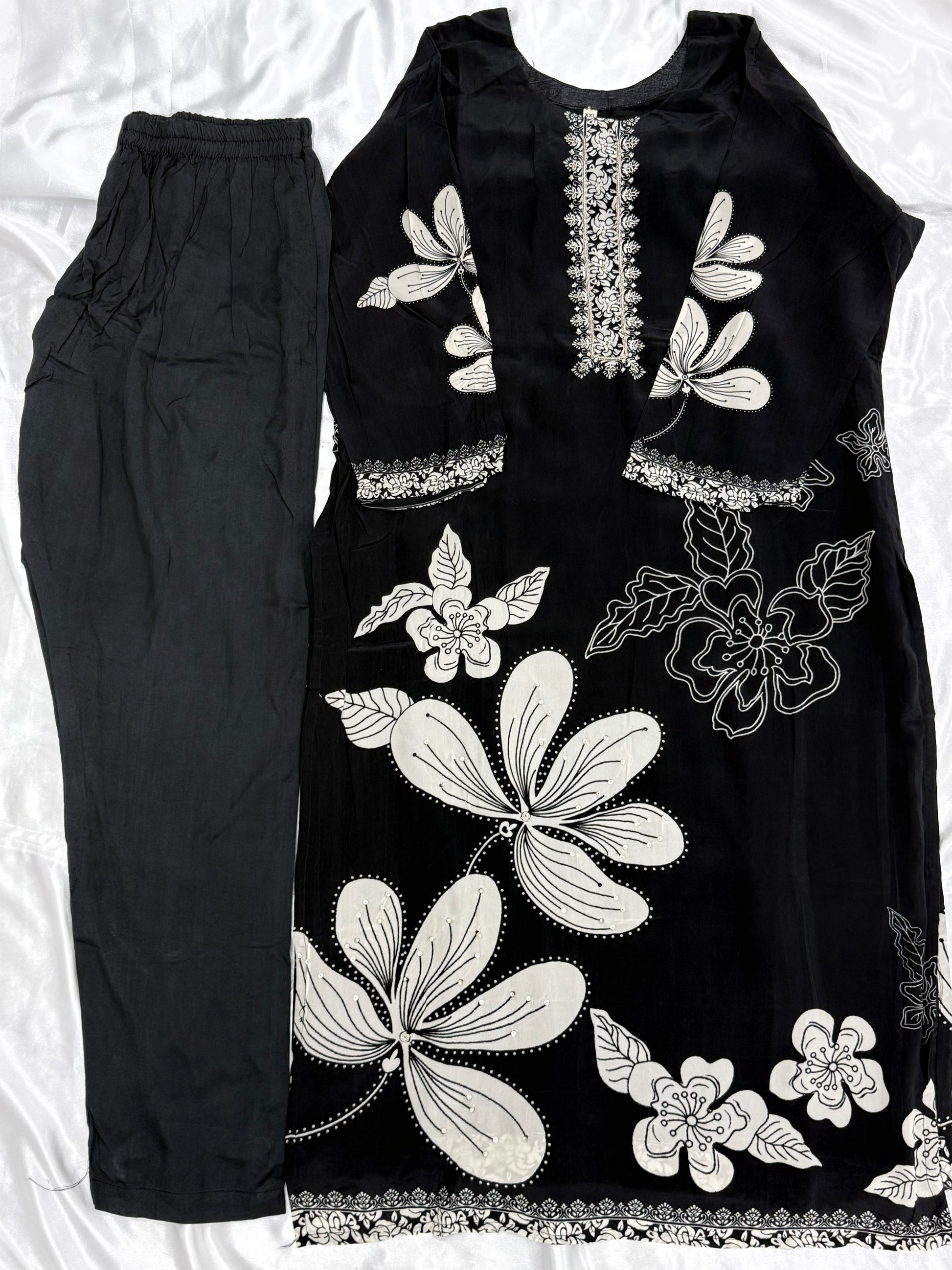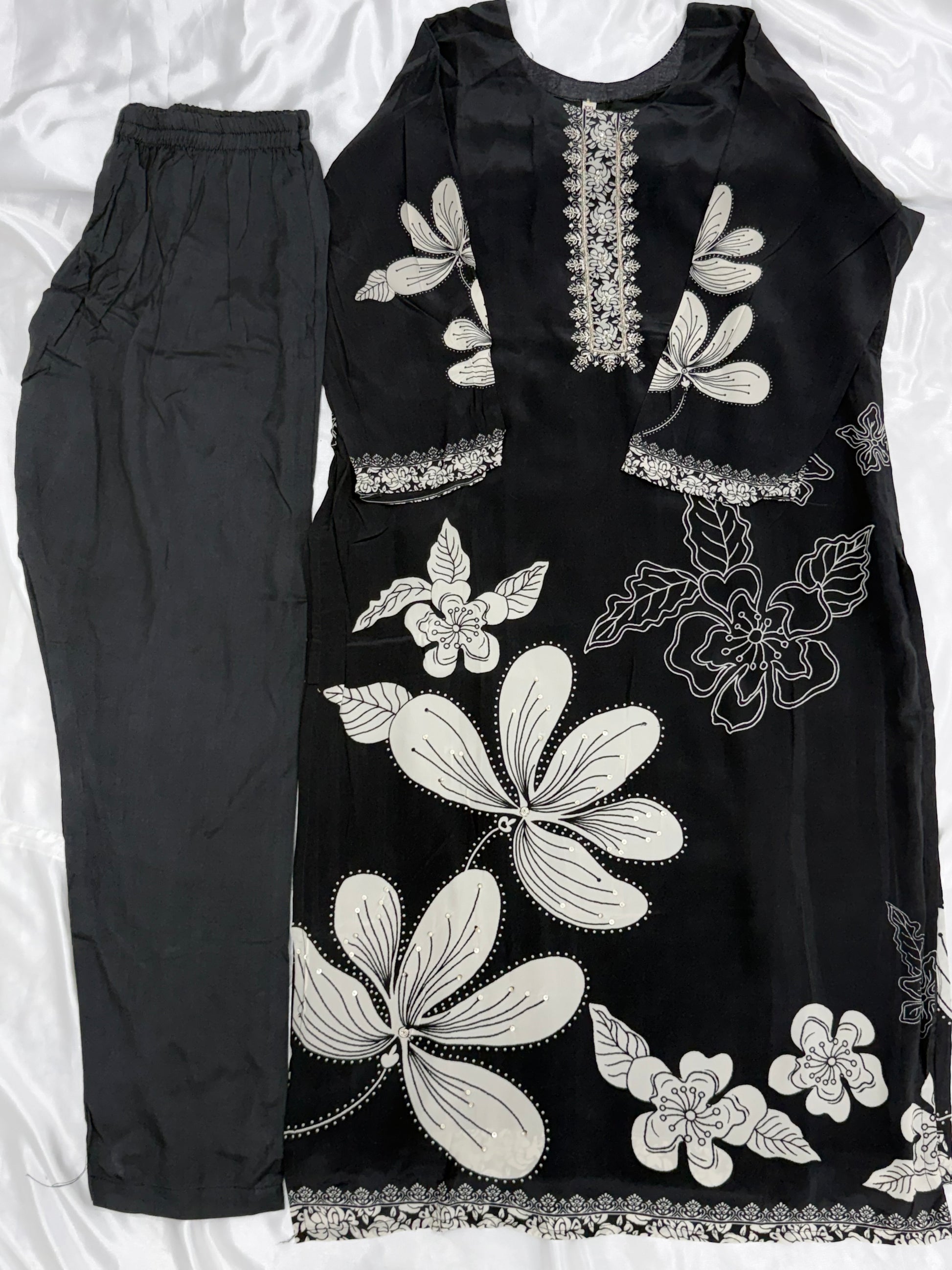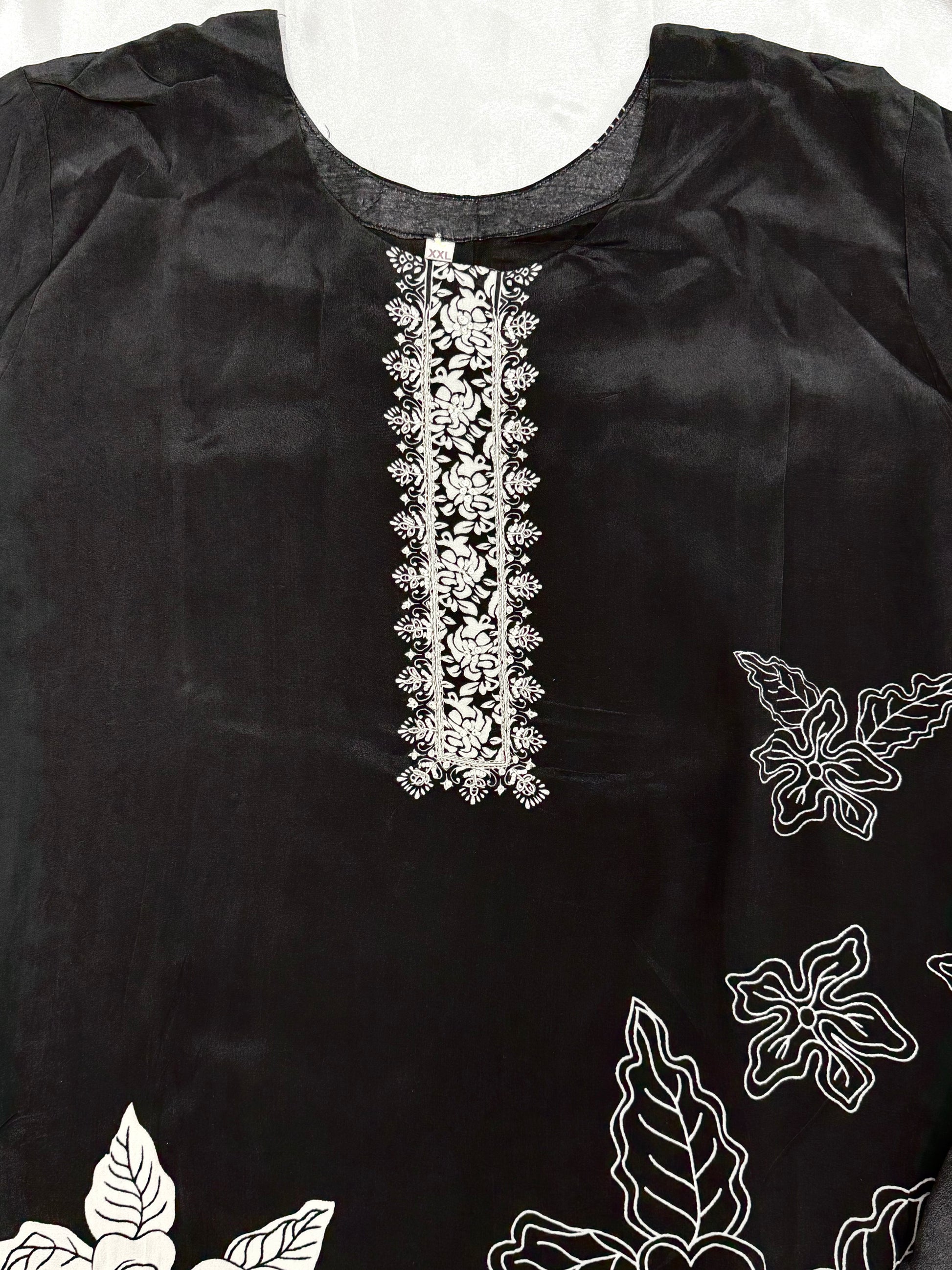 Top Muslin printed with beautiful embroidery detailing on neck. lace on sleeves and daman....length 48 inches