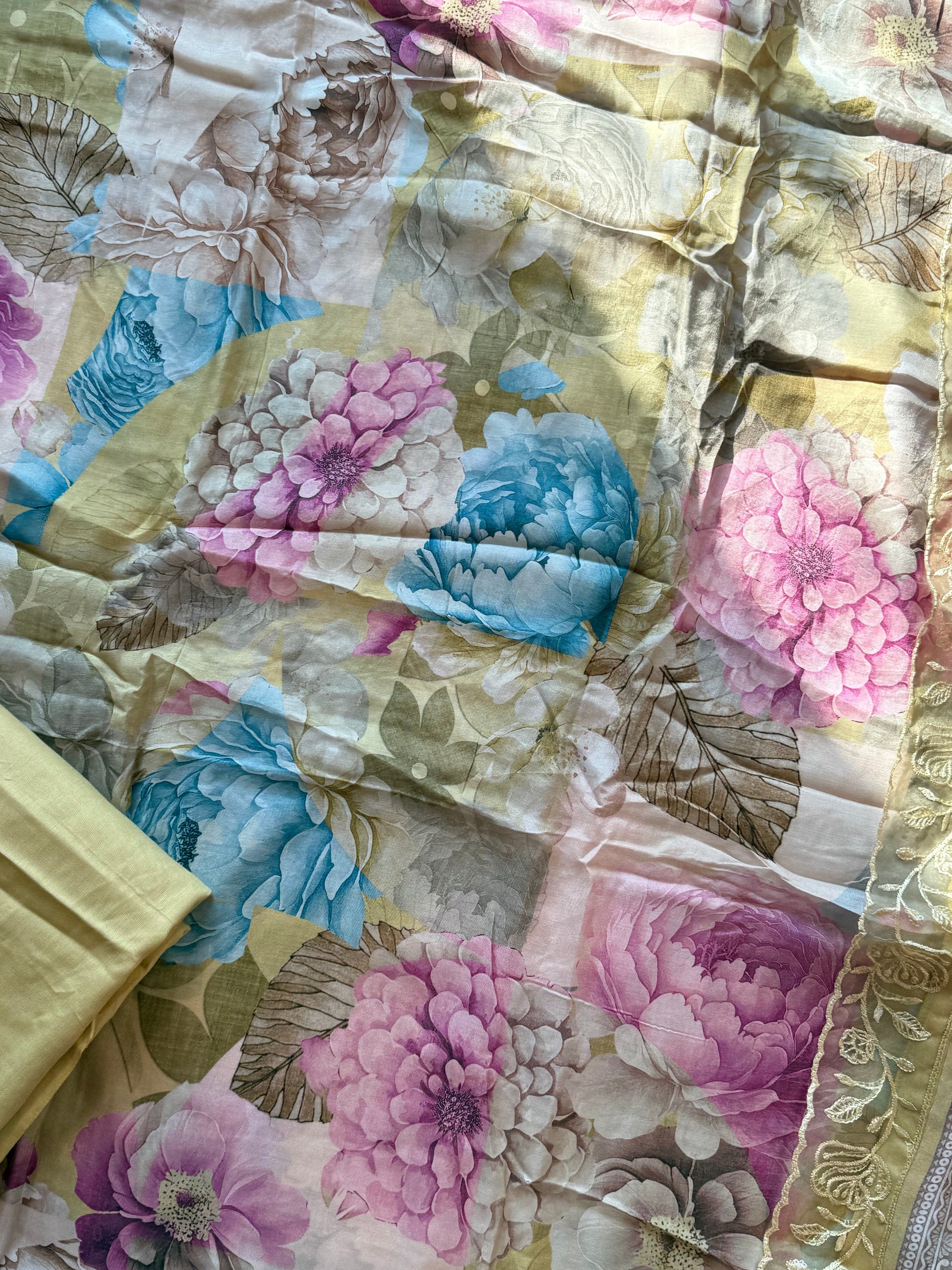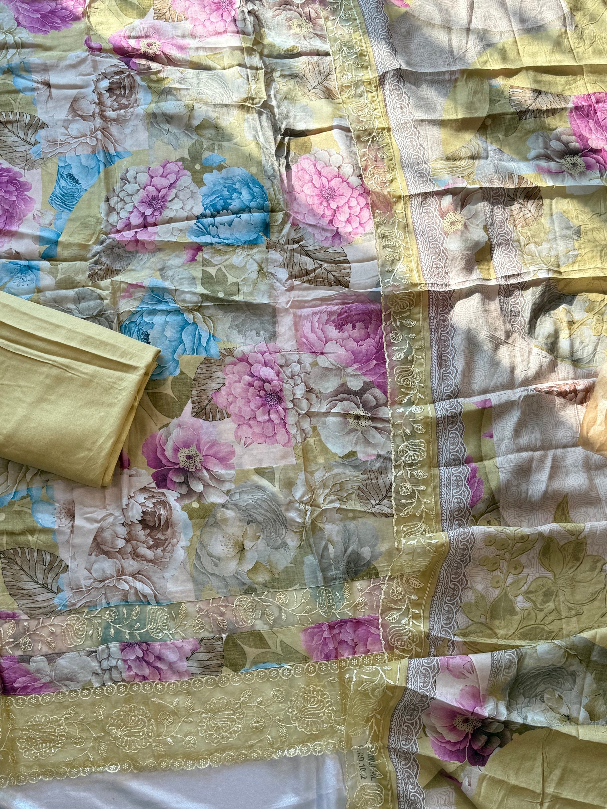 Top Pure Muslin digital printed with beautiful laces on Daman and sleeves ...length 47 Inches....Bust 54 can be stitched....extra material for sleeves