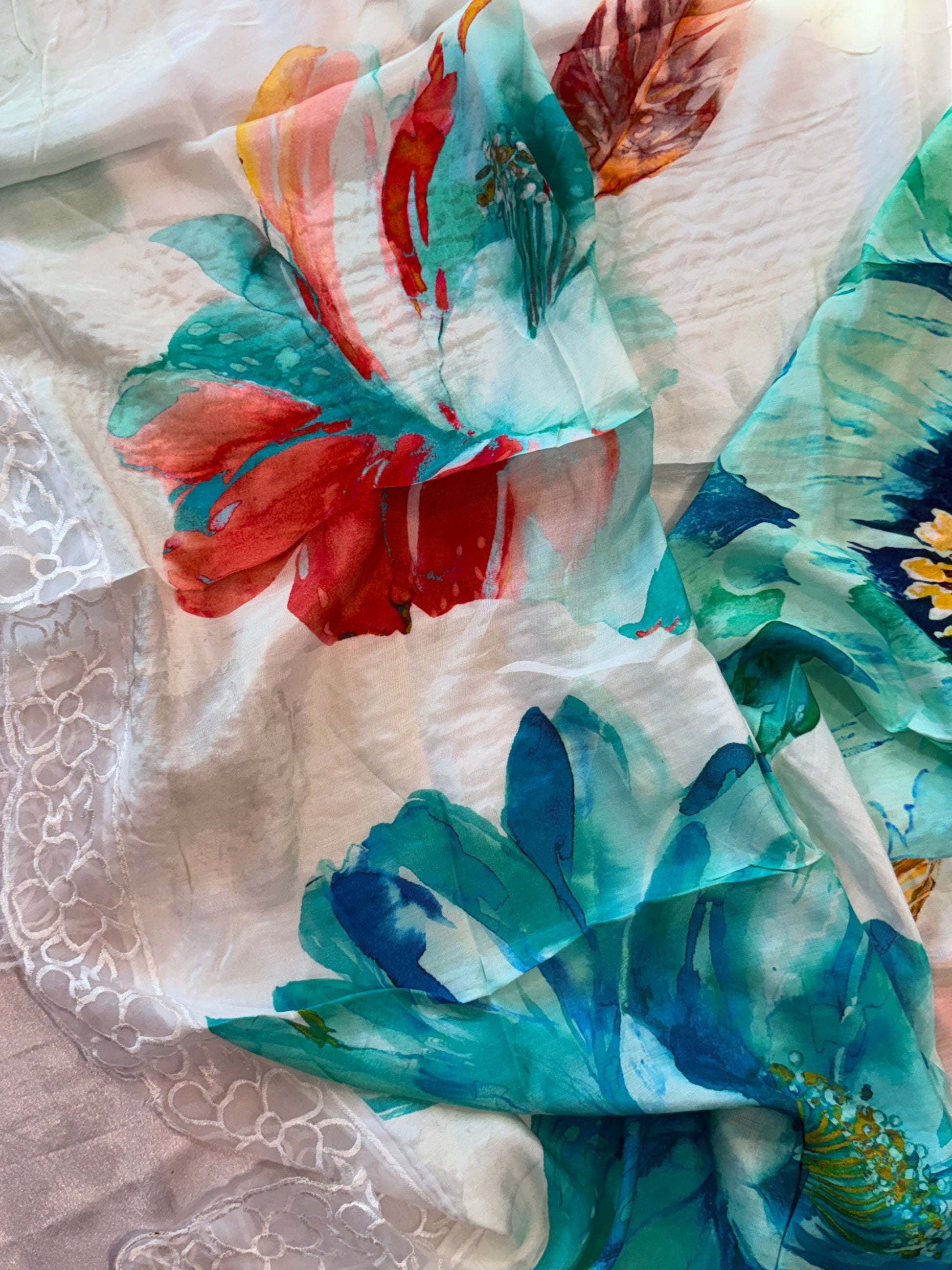 Top Pure Muslin digital printed with beautiful laces on Daman and sleeves ...length 48 Inches....Bust 60 can be stitched....extra material for sleeves