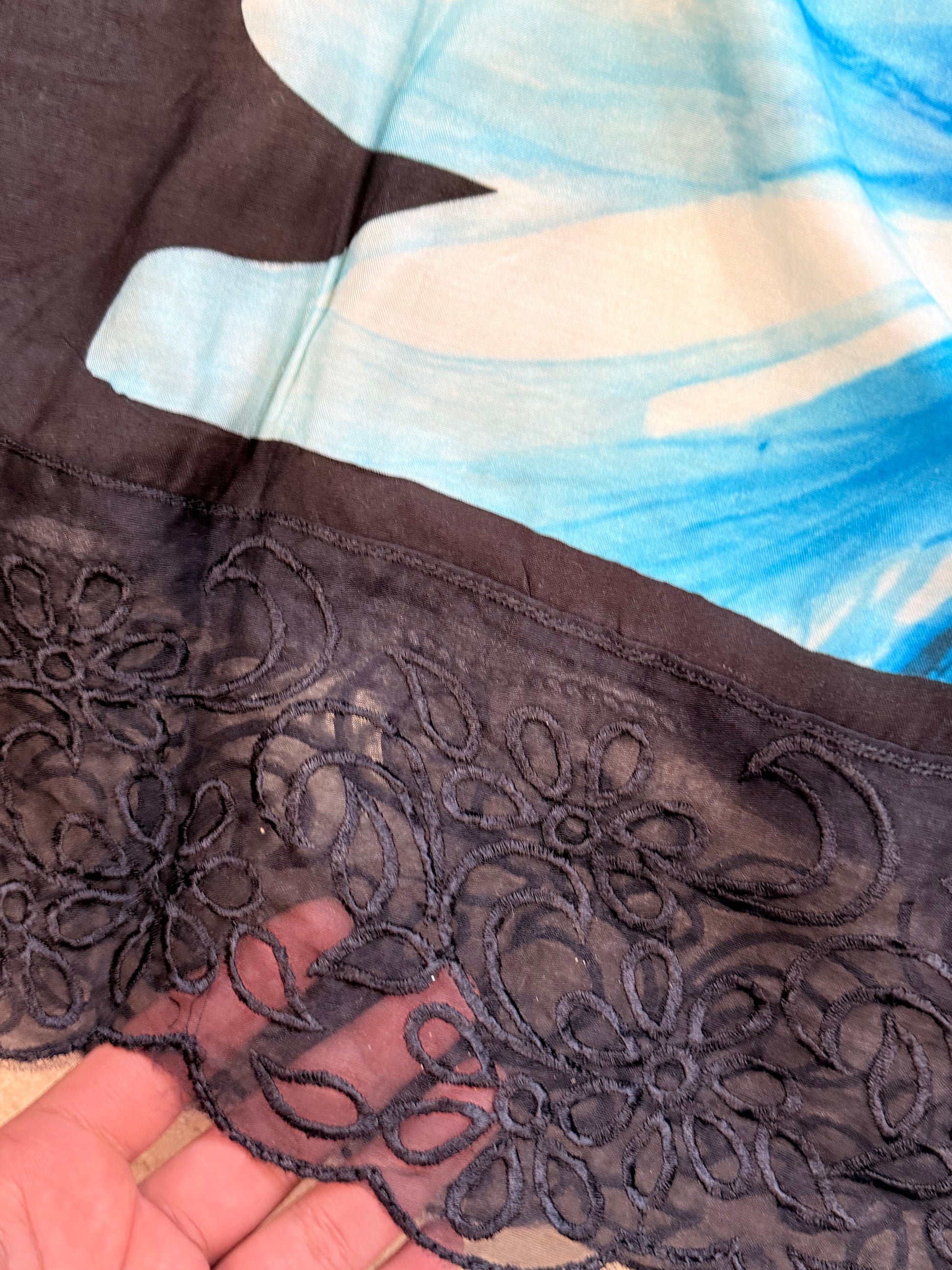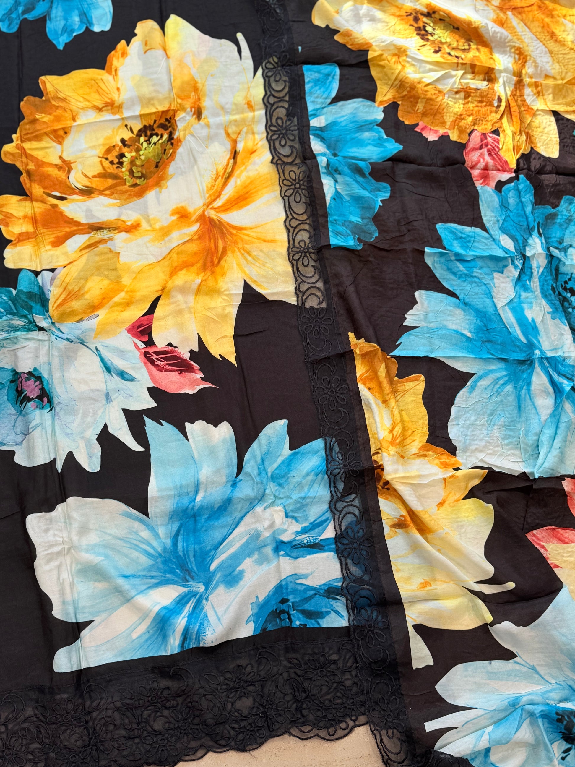 Top Pure Muslin digital printed with beautiful laces on Daman and sleeves ...length 47 Inches....Bust 56 can be stitched....extra material for sleeves