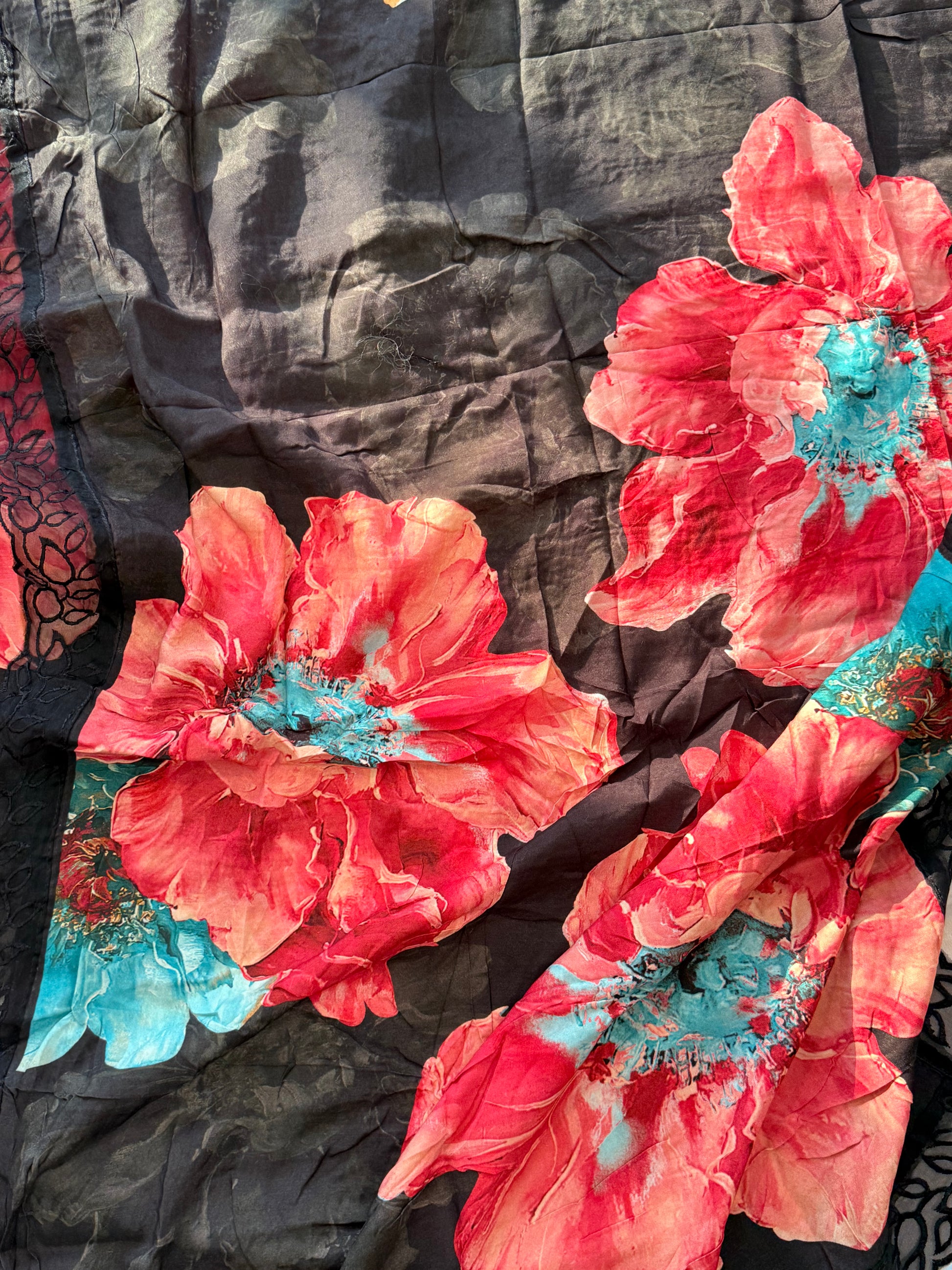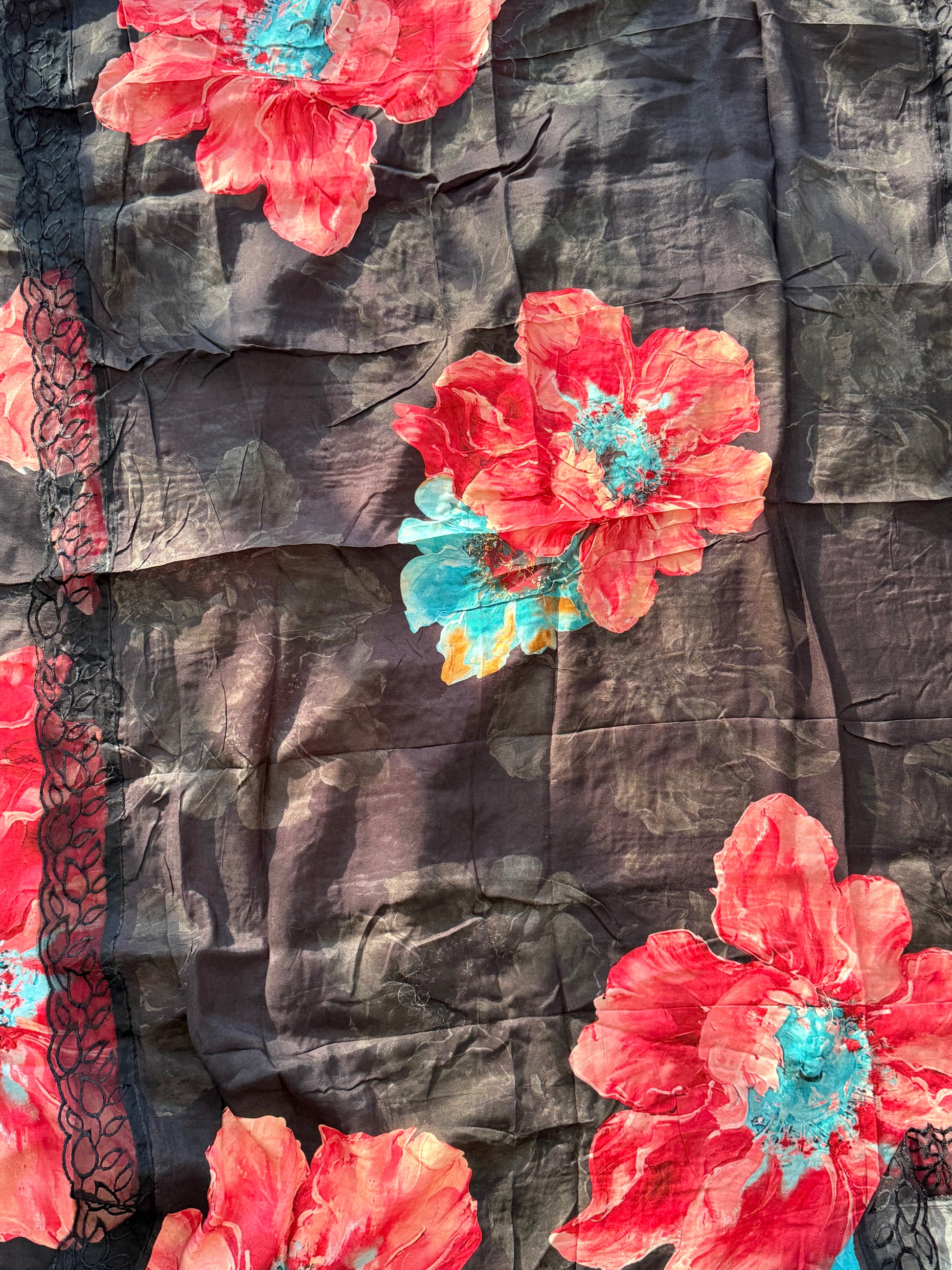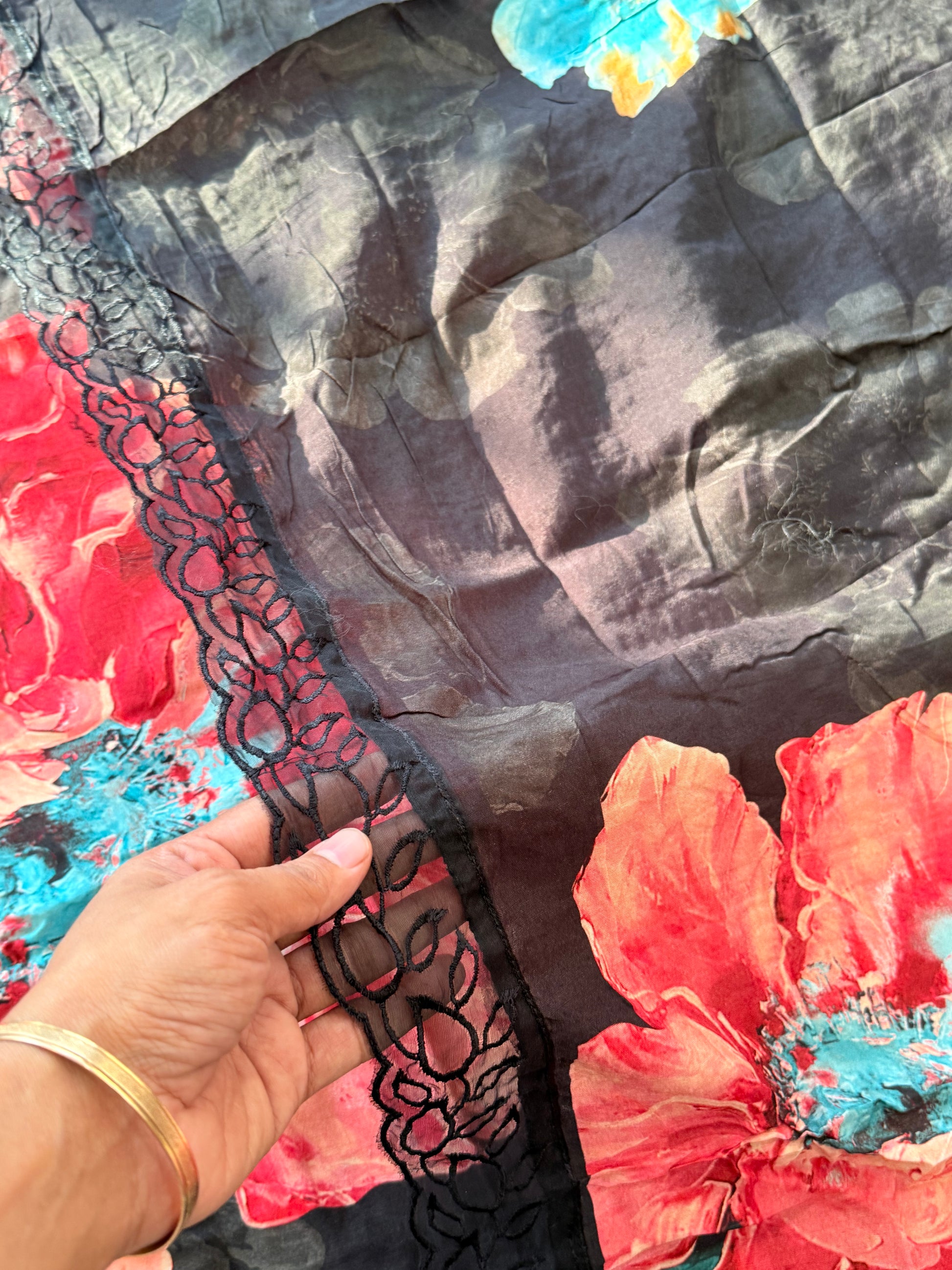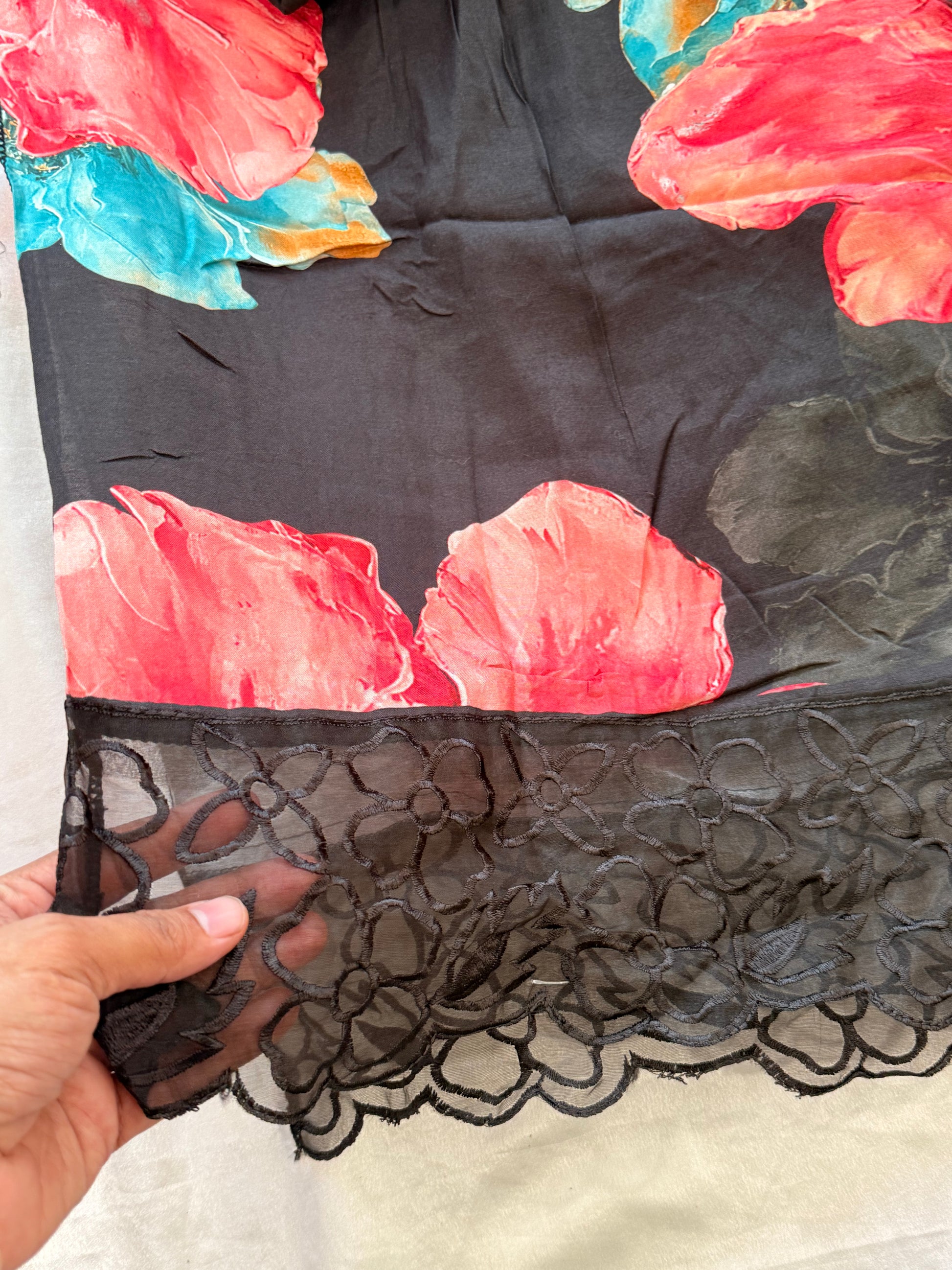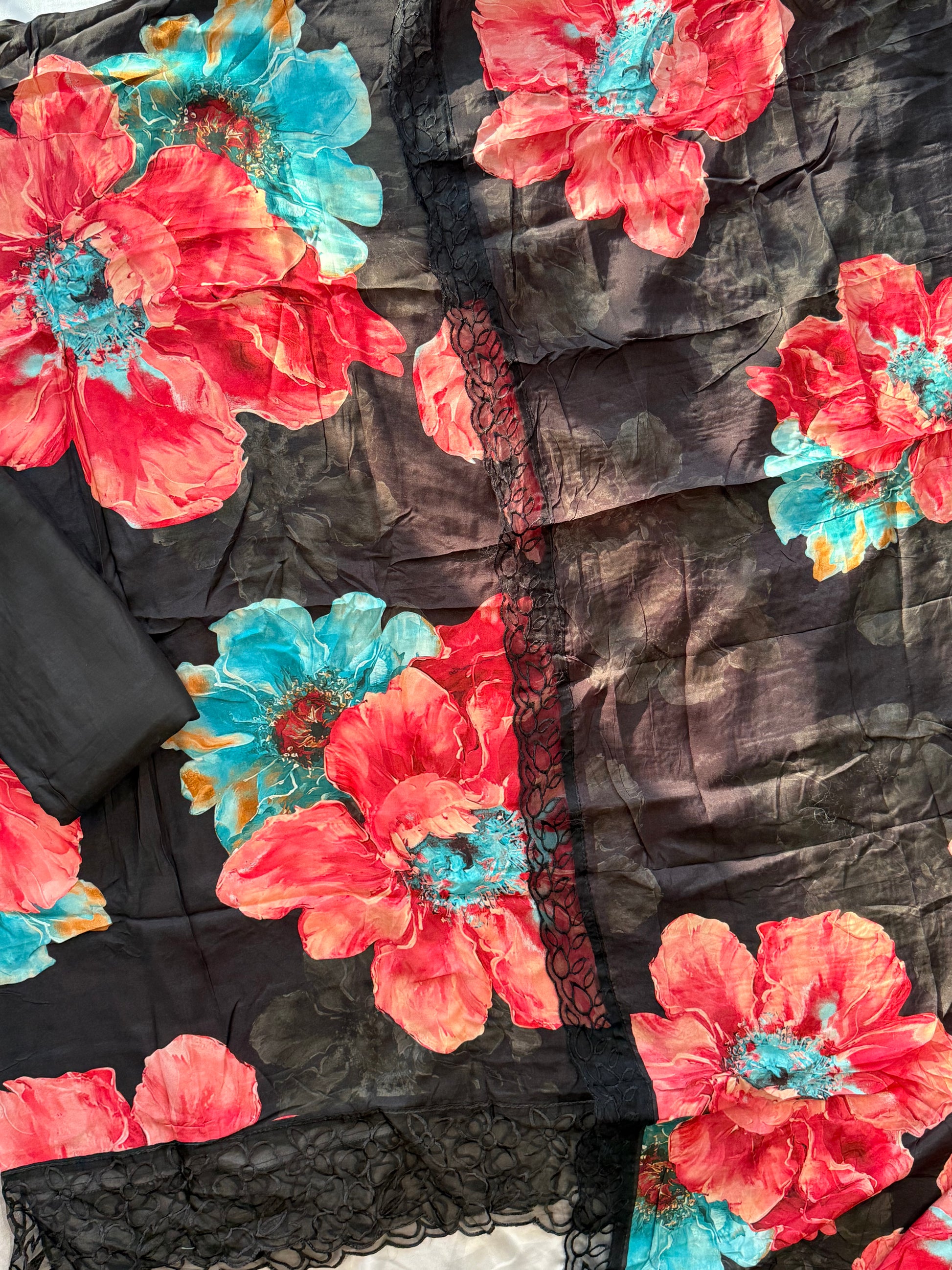 Top Pure Muslin digital printed with beautiful laces on Daman and sleeves ...length 47 Inches....Bust 56 can be stitched....extra material for sleeves