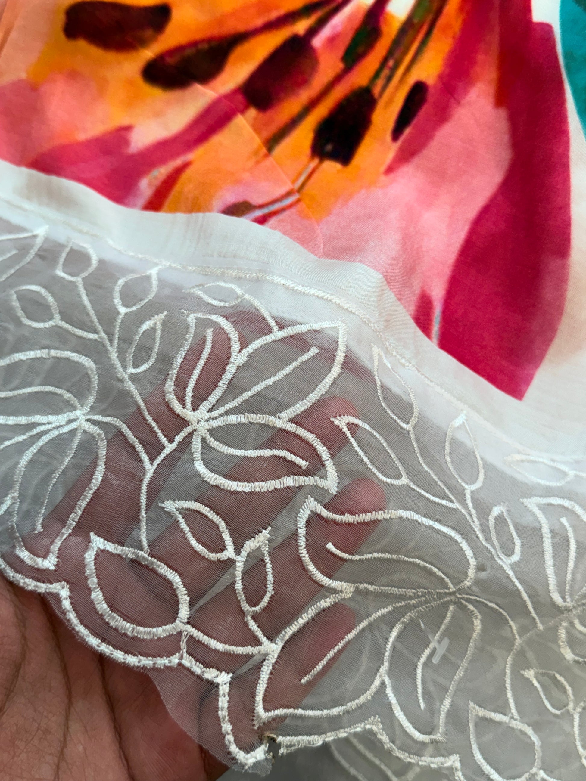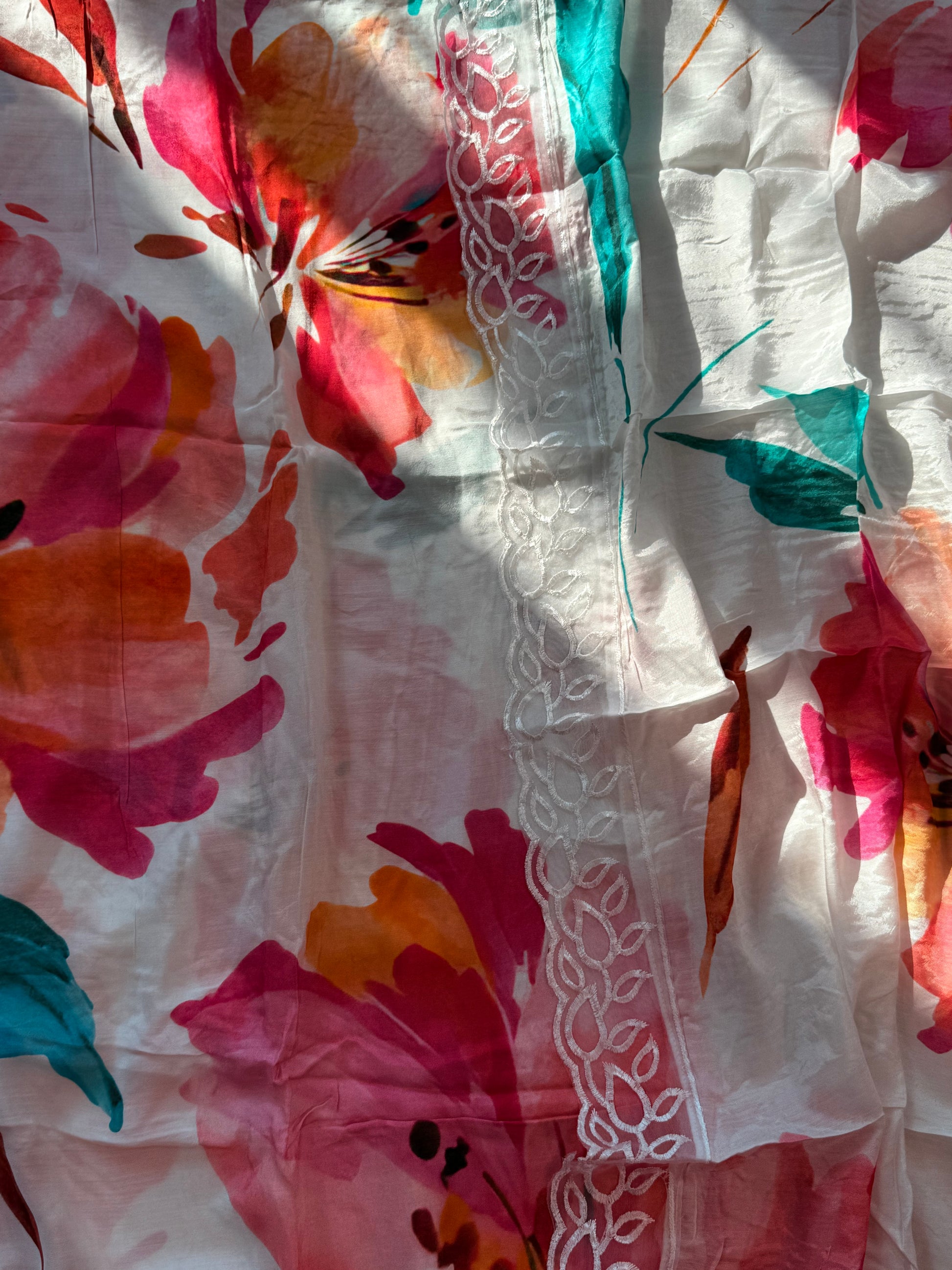 Top Pure Muslin digital printed with beautiful laces on Daman and sleeves ...length 48 Inches....Bust 60 can be stitched....extra material for sleeves