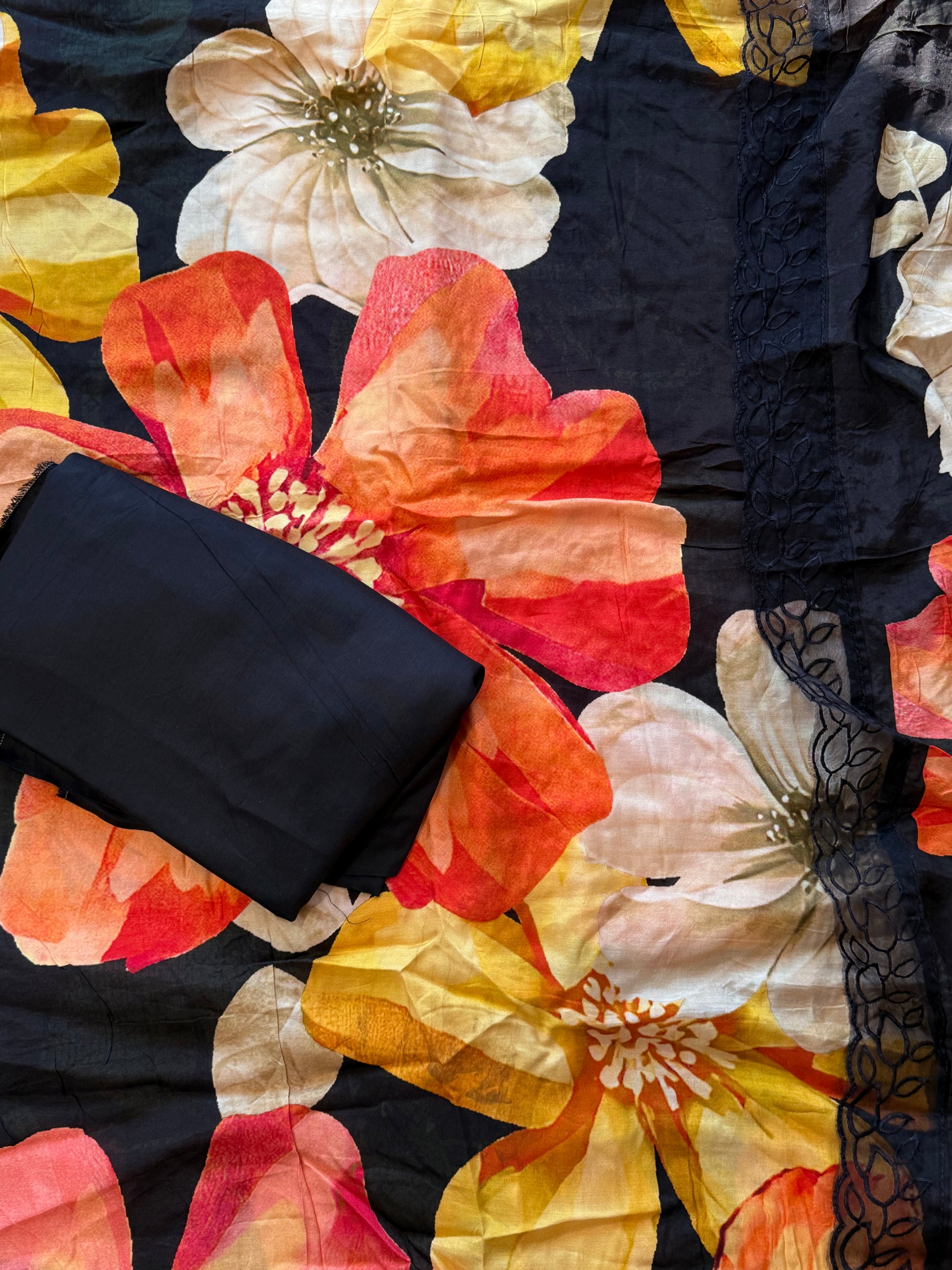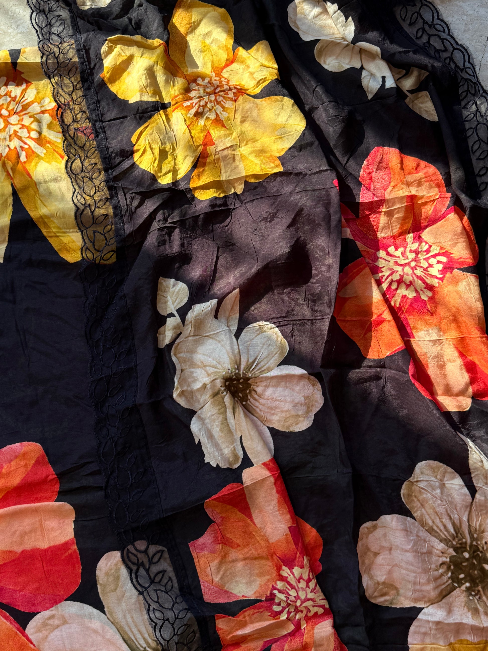 Top Pure Muslin digital printed with beautiful laces on Daman and sleeves ...length 47 Inches....Bust 56 can be stitched....extra material for sleeves