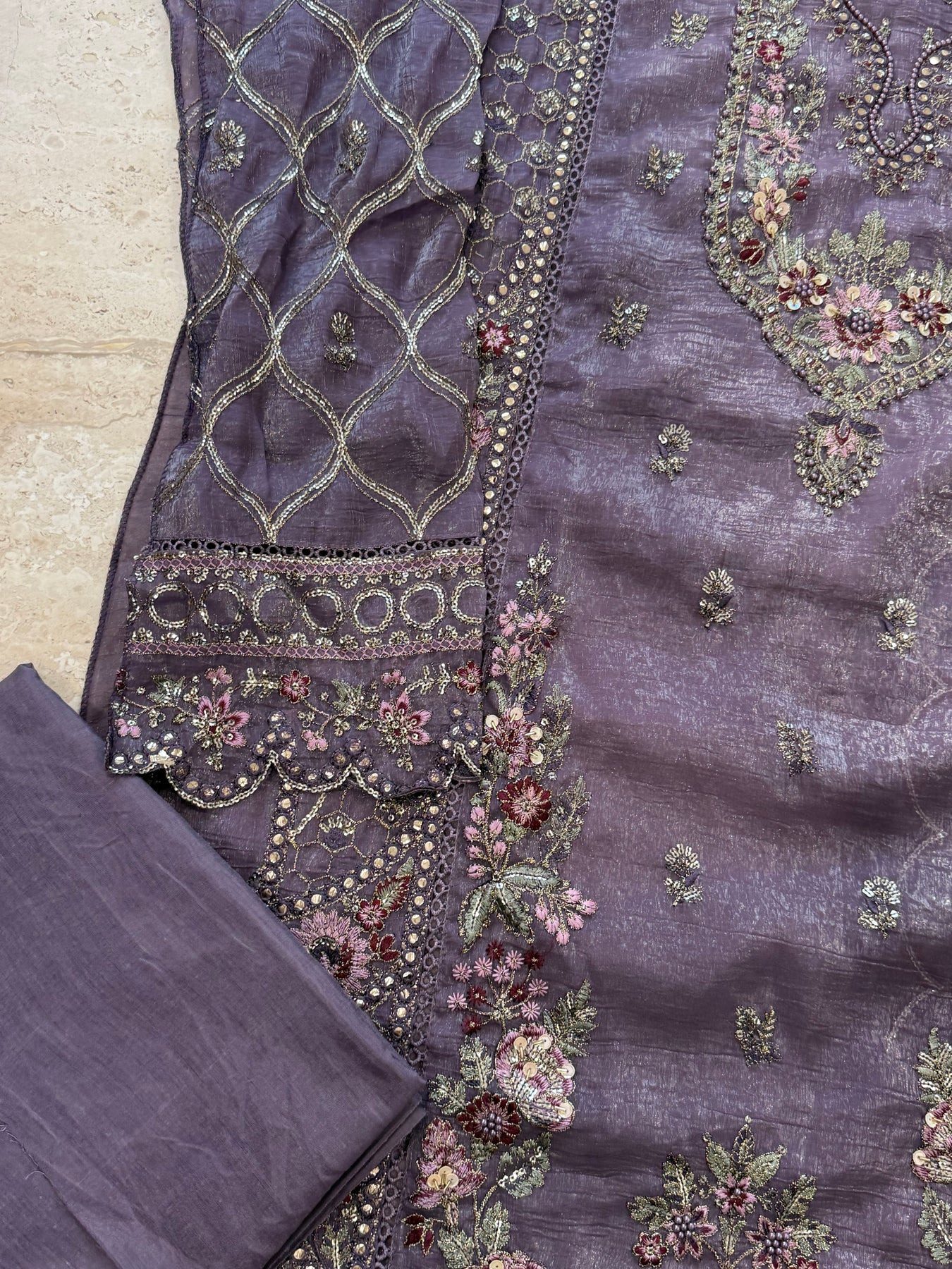 Top shimmar unstitched with beautiful heavy embroidery work....daman cutwork....top Length 46Inches...bust 52 inches