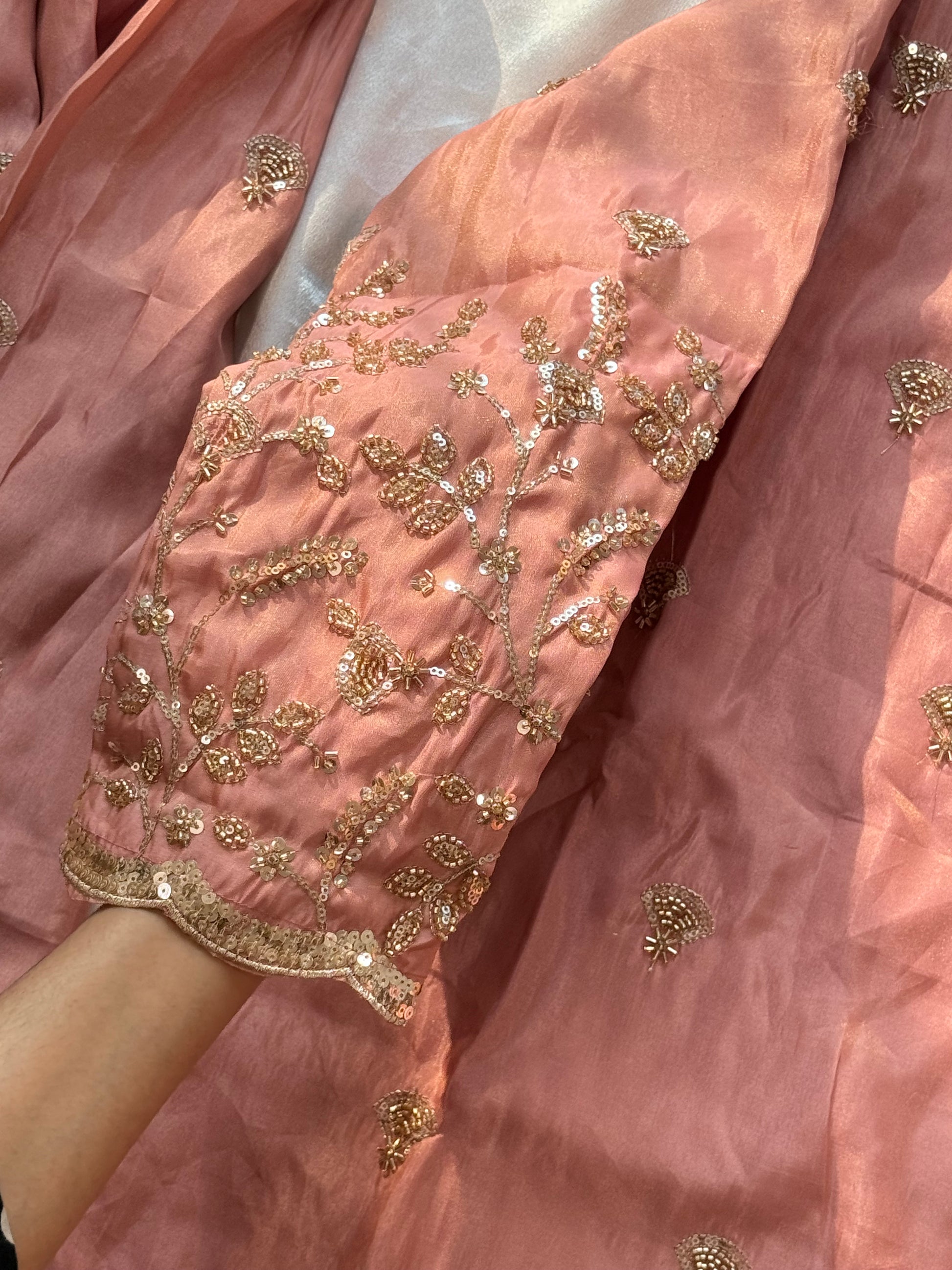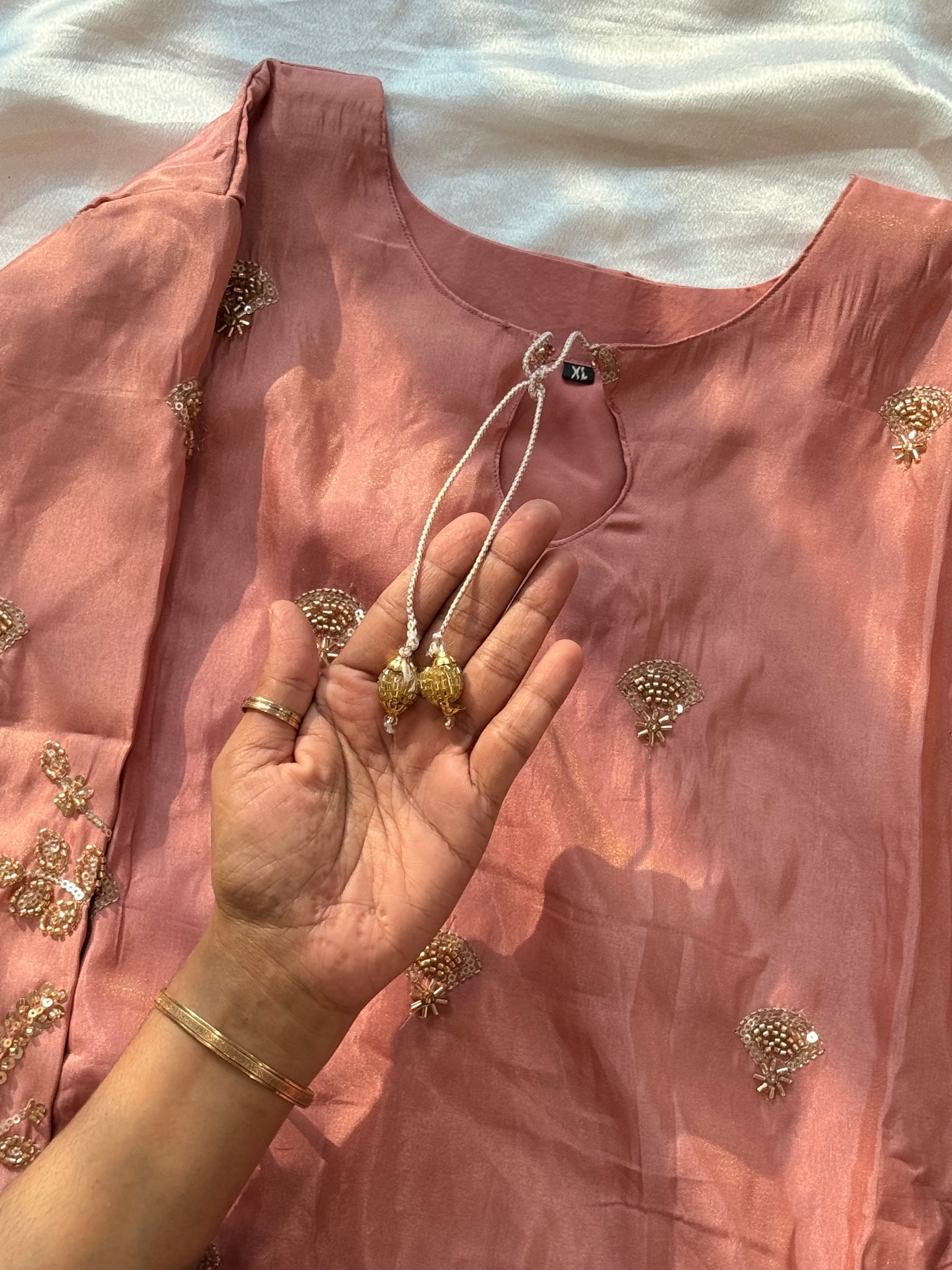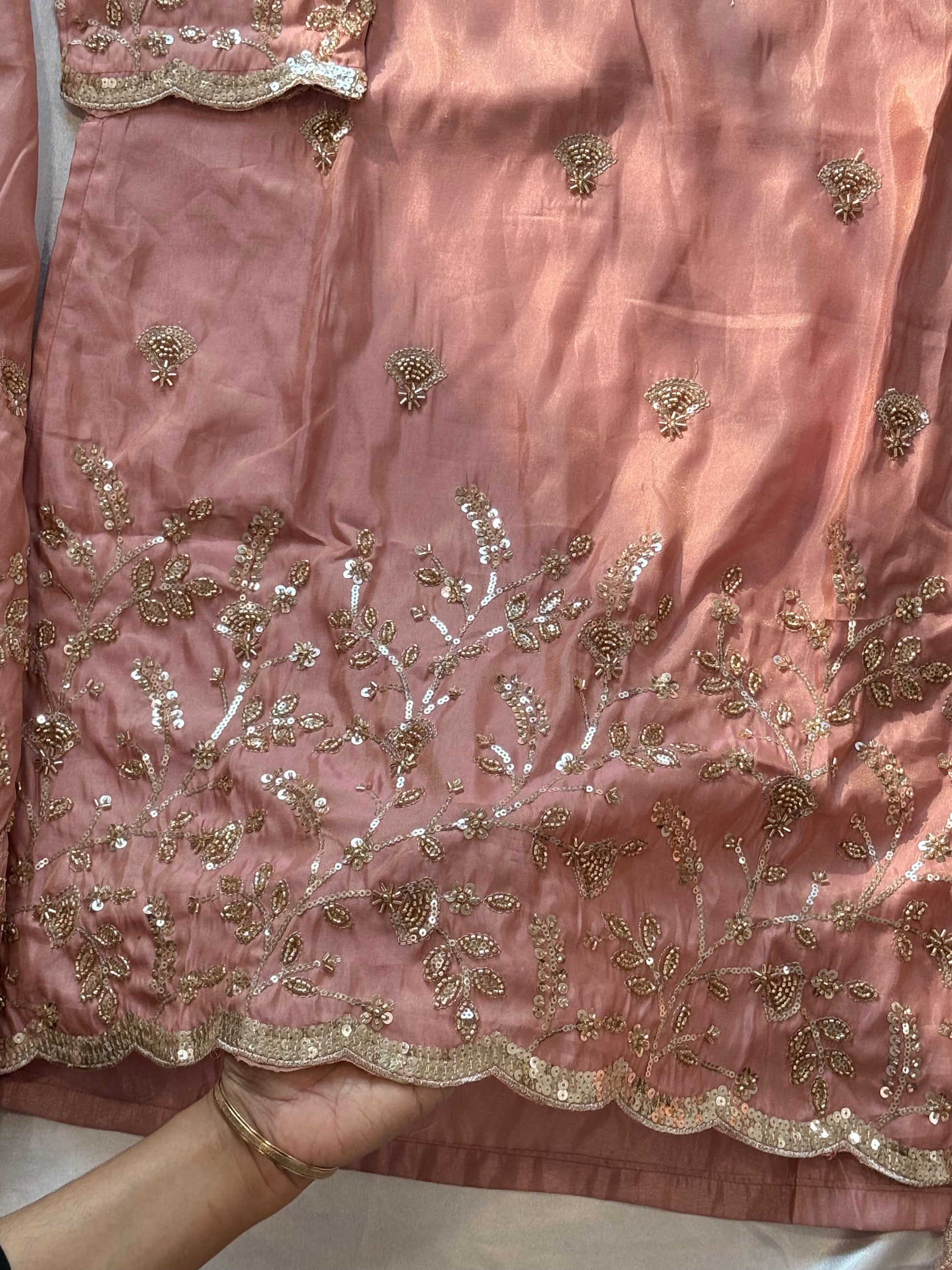 Top Cosmos silk designer stitched with lining....beautiful beads and thread handwork  on neck and  front ..length 36 inches