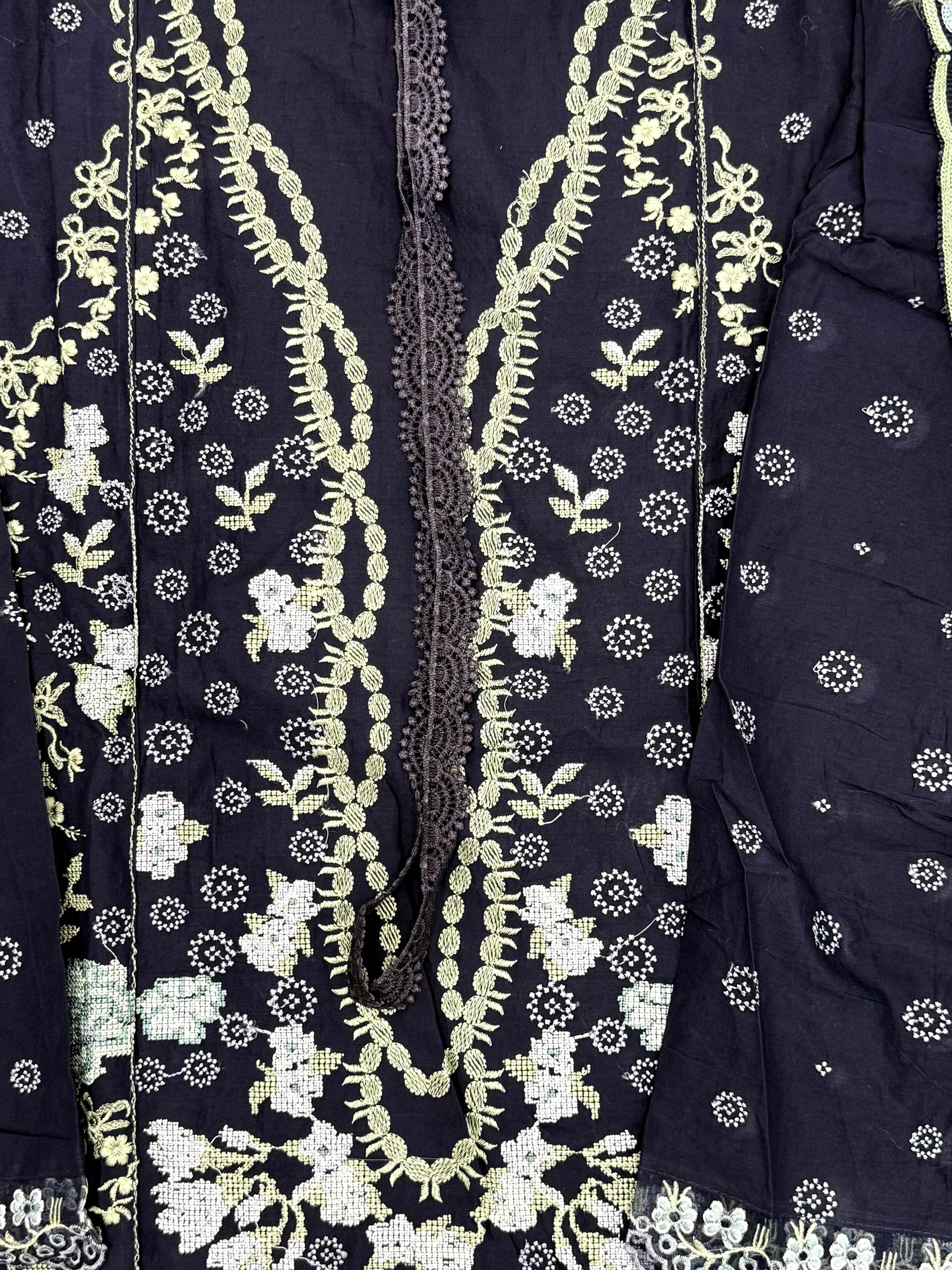 Top pure cotton designer un-stitched material with beautiful self embroidery on front.... patch for neck ... extra lace on front top......bust 54 Inches can be stitched..length 45 inches...