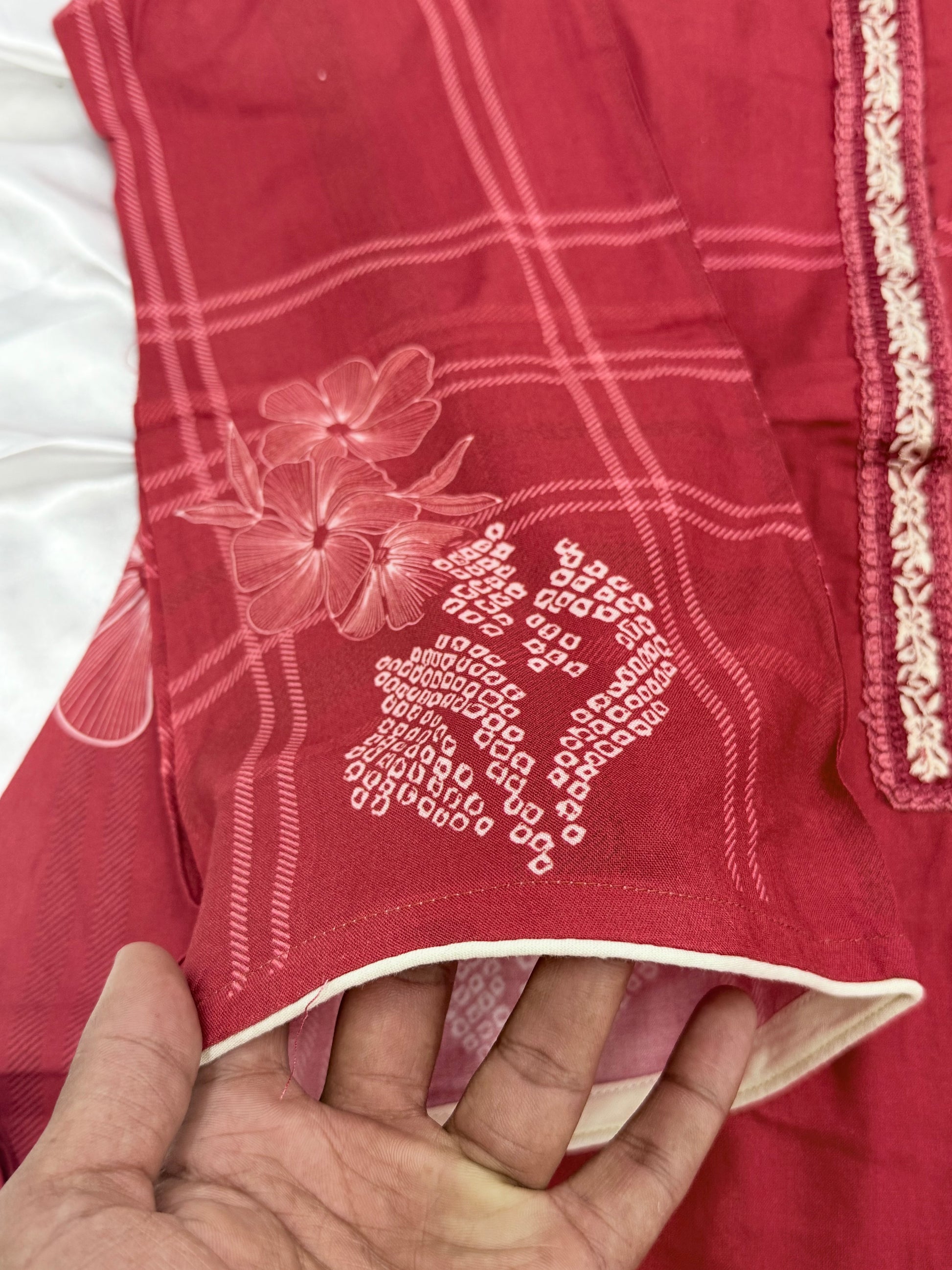 Top Lawn cotton Digital printed....Embroidery on Neck with lace.........Beautiful attached patch on top....cord pipin on neck and sleeves sleeves