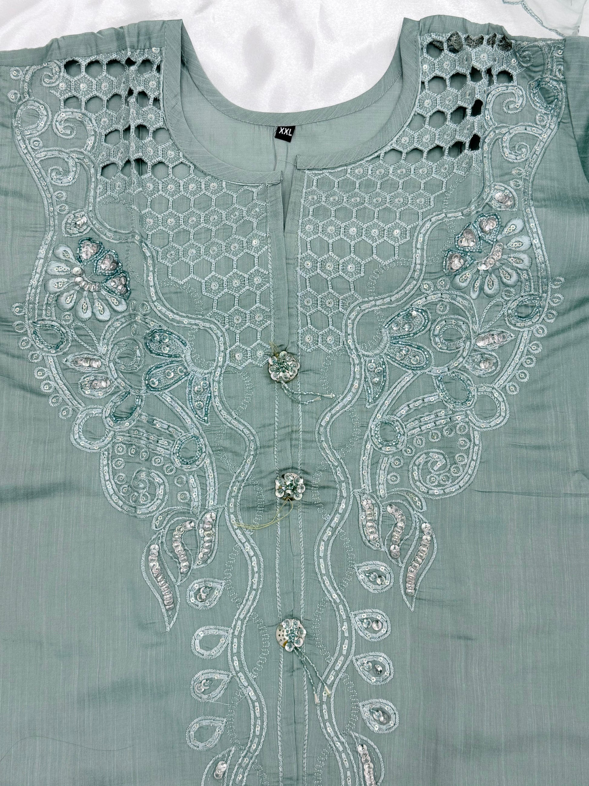 Top Muslin with beautiful cutwork detailing on neck, sleeves and daman with hand work....lenght 45inches
