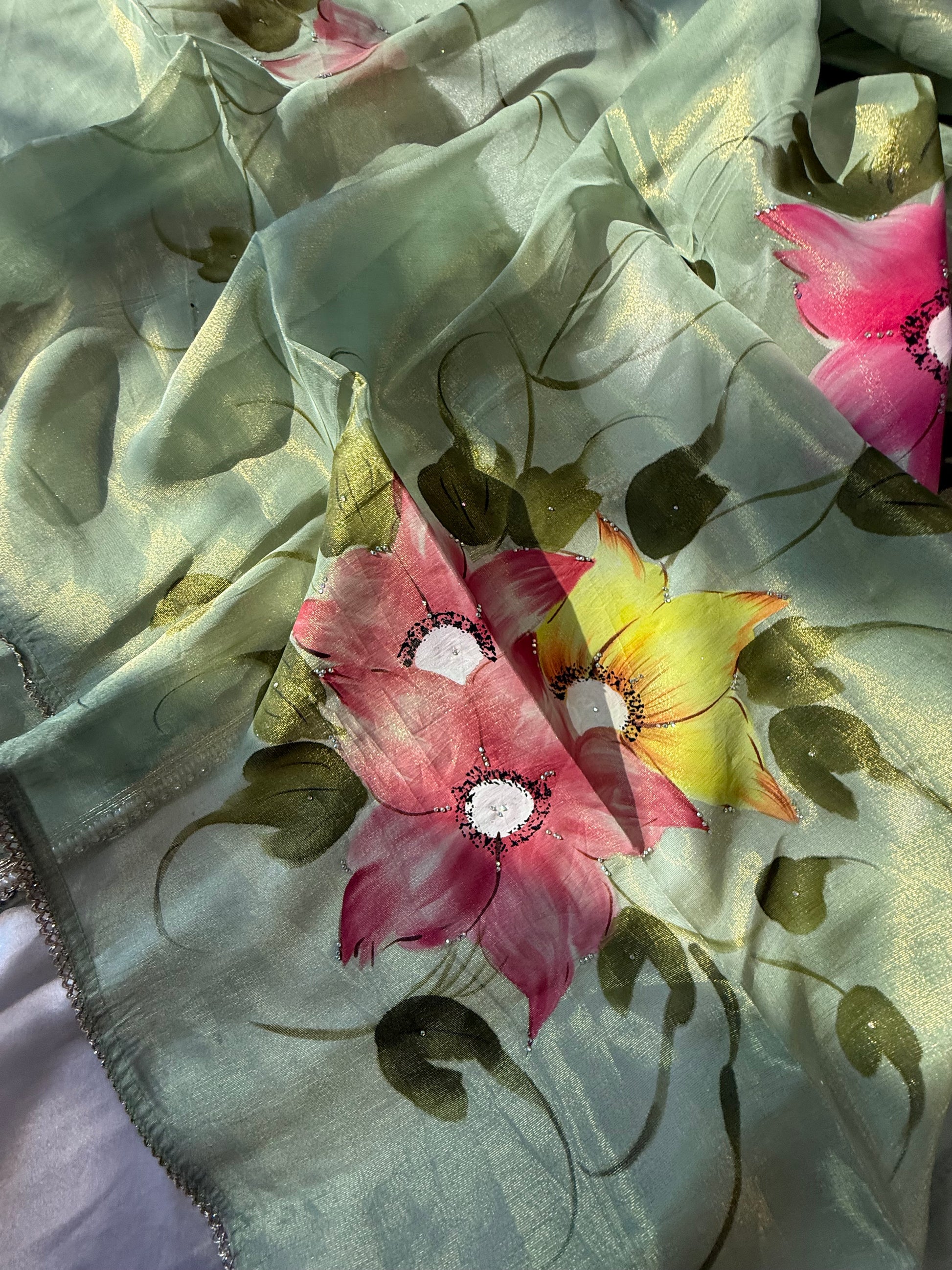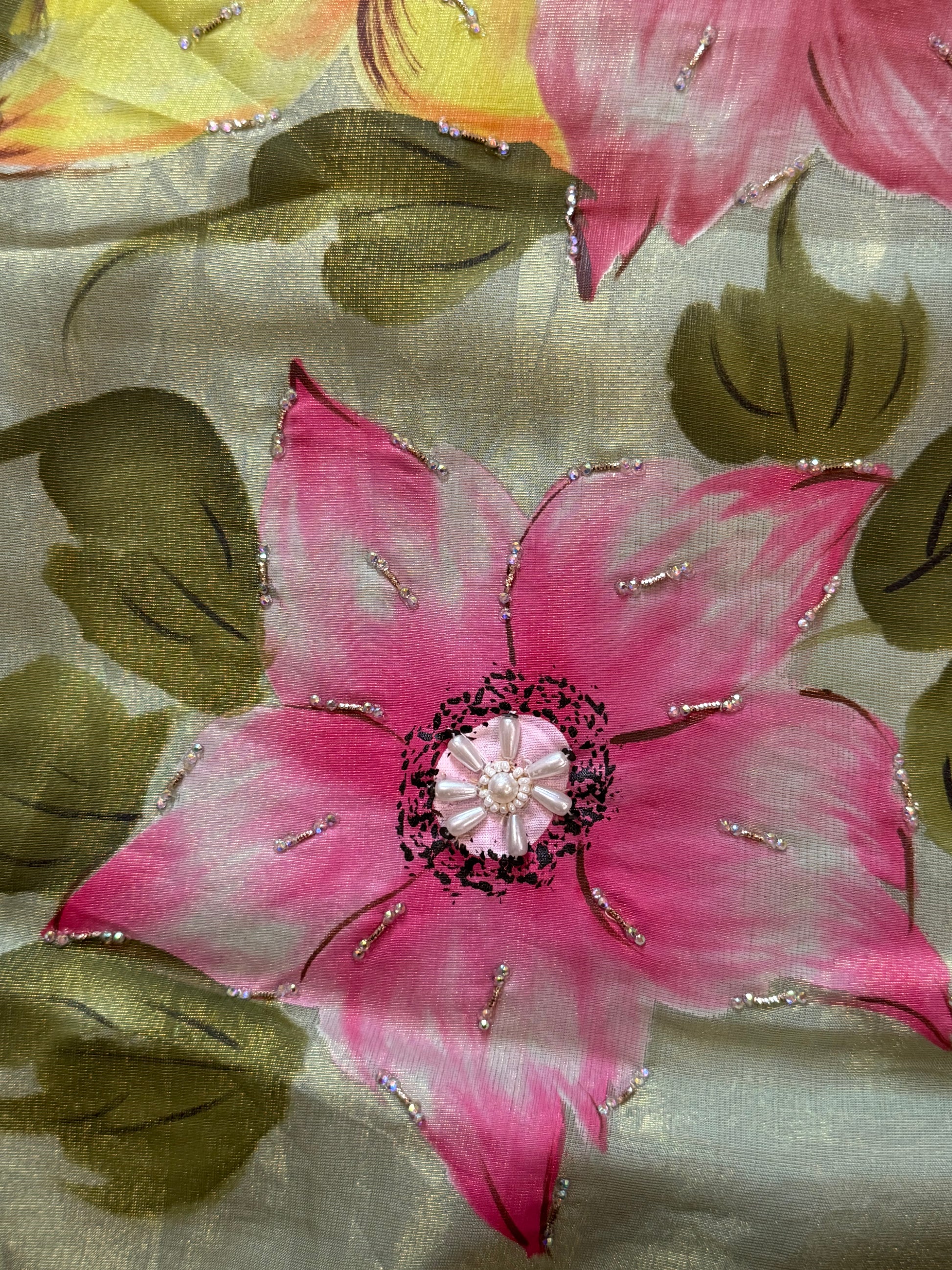 Top Shimmer Organza material with hand painting and hand work on front.....Pearl and Sequence work...Length 48 inches....52 chest can be stitched