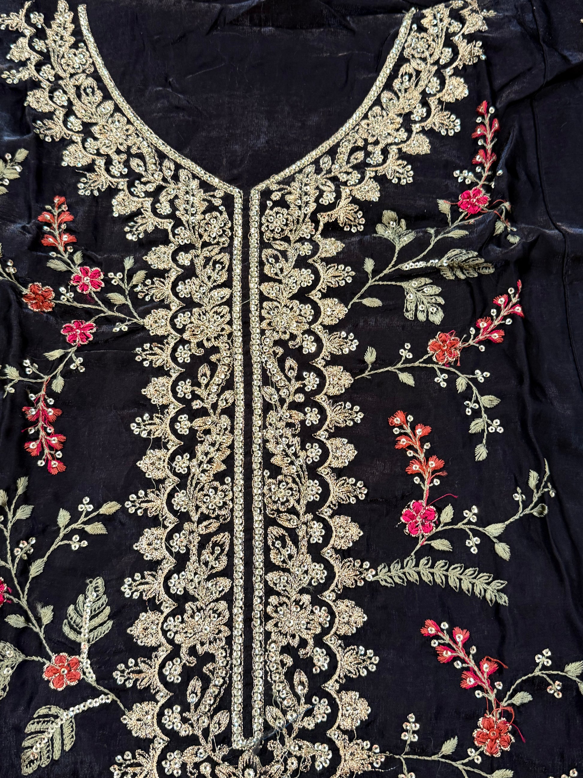 Top pure glass Organza material with heavy embroidery on front.....thread and Sequence work..... organza boarder on front...Length 45 inches....54 bust can be stitched